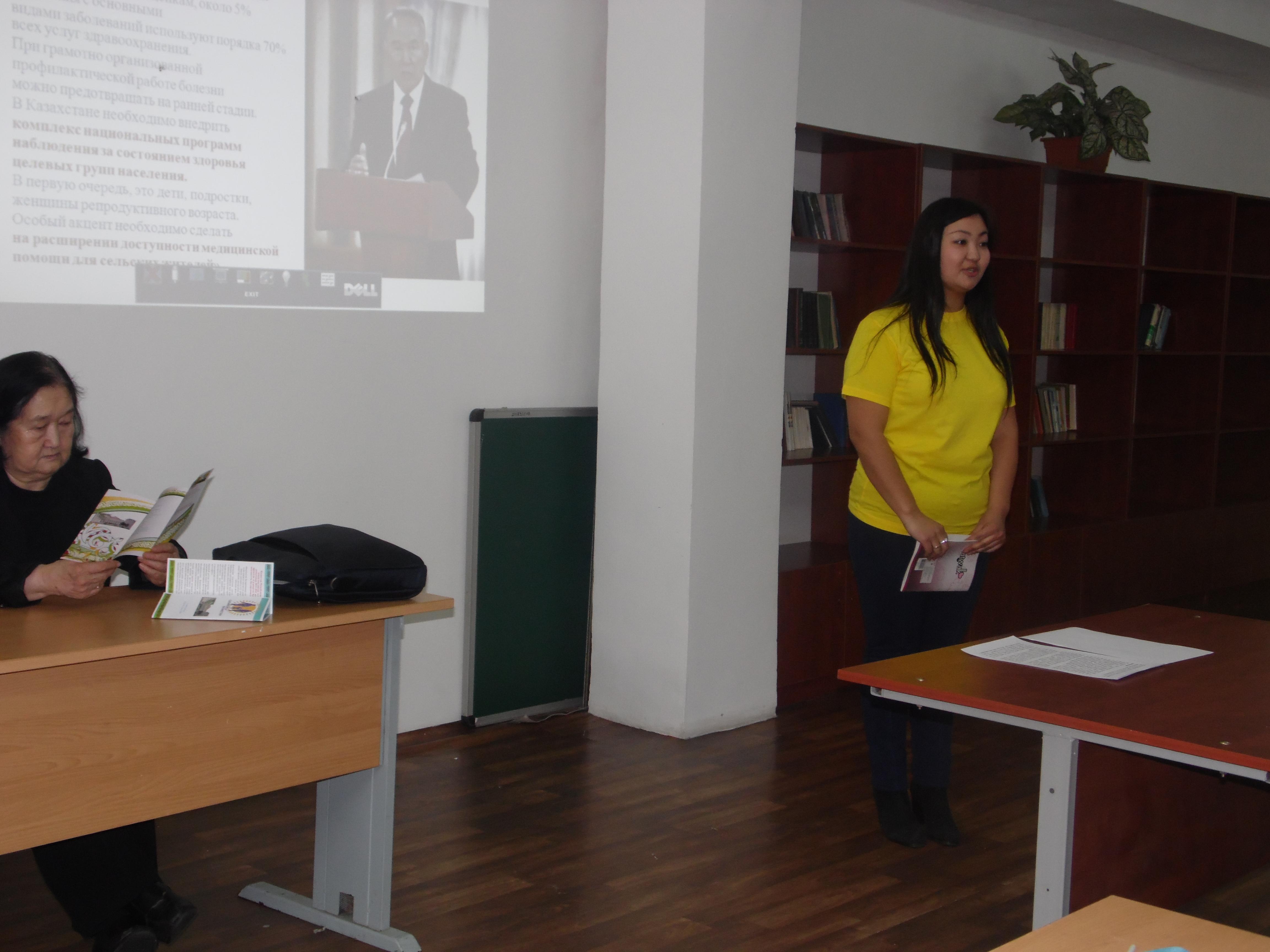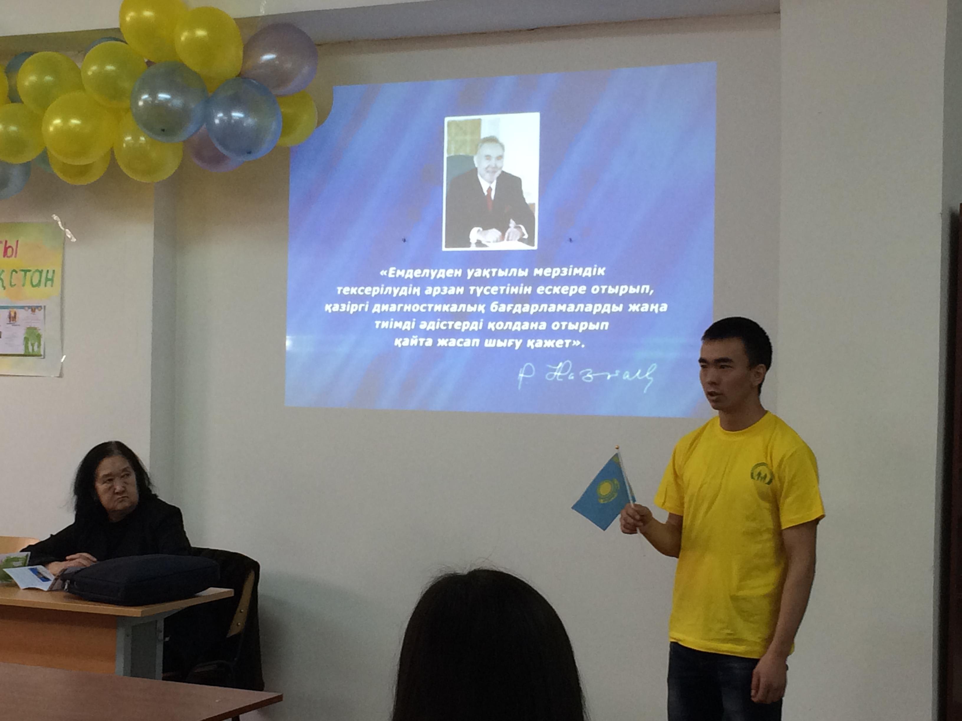 Среди широкого перечня программ нашего государства, есть программы от успешной реализации которых напрямую зависит качество жизни граждан нашей республики. Одной из таких программ является государственная программа «Саламатты Казахстан», принятая Указом Президента Республики Казахстан от 29 ноября 2010 г. Студентами 3 курса Общей медицины в общежитии № 6 проведена акция, в поддержку государственной программы «Саламатты Казахстан». Почетным гостем в проведении акции стала советник ректора по работе со студентами, заслуженный врач РК, д.м.н., проф. Мустафина Ж.Г. В акции участвовали преподаватели модуля нормальной анатомии – проф. Дюсембаева А.Т., доцент Исабекова У.А., ст. преподаватель Абилова А.А., тьюторы групп, представители деканата общей медицины. Всем участникам, гостям и студентам общежития были розданы программы, в которых были освещены основные цели и задачи государственной программы «Саламатты Казахстан». Студенты в своих выступлениях подчеркнули, что основным приоритетом в здравоохранении станет значительное усиление профилактической медицины и социальной направленности здравоохранения. При этом ход реализации программы контролируется конкретными цифрами (индикаторами) увеличения продолжительности жизни, снижения материнской и младенческой смертности, снижения заболеваемости туберкулезом, уменьшении общей смертности, контроля распространенности ВИЧ-инфекции. Программа «Саламатты Казахстан» реализуется уже несколько лет и студентами были выделены достигнутые результаты. Так, для обеспечения доступности медицинской помощи, особенно для сельских жителей, проживающих в отдаленных и труднодоступных регионах, государством поддержано развитие транспортной медицины, были организованы передвижные медицинские комплексы на железнодорожном и автомобильном транспортах, оснащенных диагностическим оборудованием, лабораториями, с приемом узких специалистов и непосредственными консультациями с ведущими специалистами через теле-мосты. После выступления студентов проф. Мустафина Ж.Г. поблагодарила студентов и всех участников акции, которые отметили большую работу, проводимую государством в обеспечении здоровья народа Казахстана, а также подчеркнула, что и нашим университетом проводится большая работа по реализации программы «Саламатты Казахстан», необходимо постоянно информировать о достигнутых результатах и чтобы подобные мероприятия, как эта акция, проводились как можно чаще. В тоже время Жанар Габиденовна отметила, что наше здоровье – в наших руках. Необходимо избегать вредных привычек, вести подвижный образ жизни, правильно питаться. Поправить свое здоровье можно, изменив поведение на здоровый образ жизни.