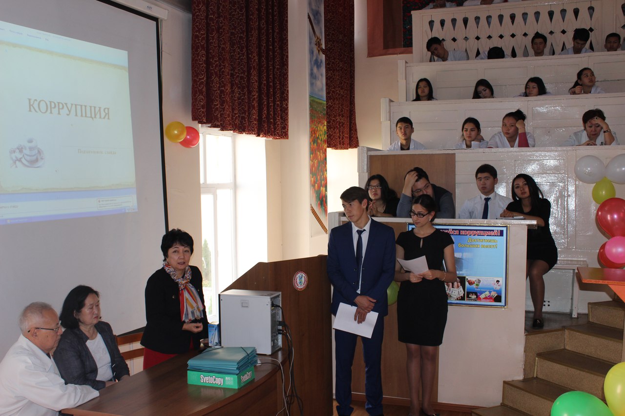 Особенно понравилась всем сценка  «Коррупция в медицине» с участием студентовҚұлдыбай Әсем, Нурсеит Нуркен, Чәкен Ержан, Оразғалиева Назерке, Әбдікерім Балтөре, Ескендір Дина. Завершилось мероприятие викториной «Эрудит.Коррупция». Участникам были вручены грамоты, гости выразили благодарность организатораммероприятия.