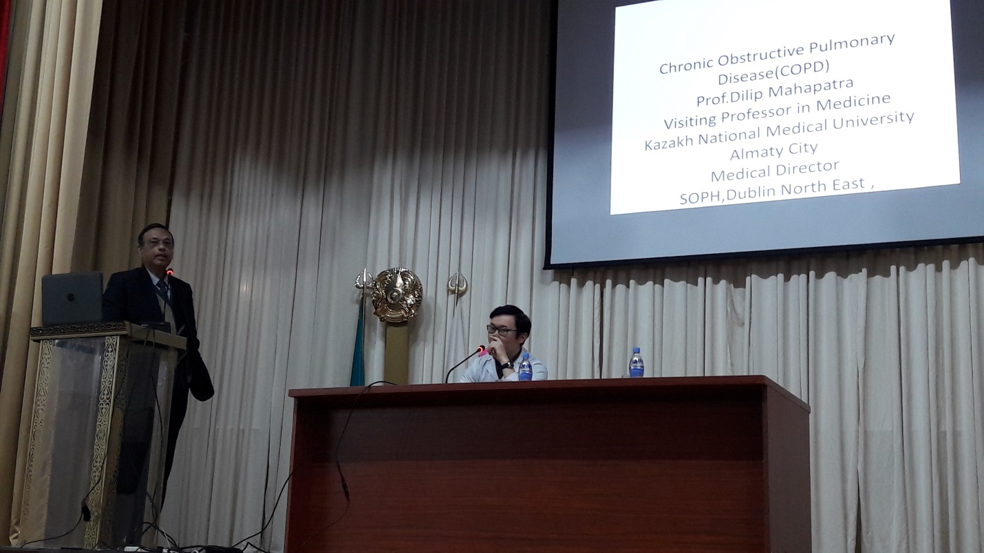 Также на клинической базе кафедры ВБ№1 –ГКБ№1 профессором Dilip Mahapatra была проведена лекция на тему «Хроническая обструктивная болезнь легких» с учетом специфики клиники и работы пульмоцентра г.Алматы, где совместно с врачами ведут лечебно-консультативную деятельность сотрудники кафедры.