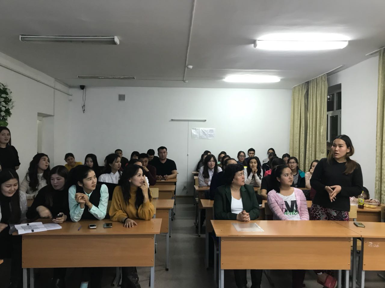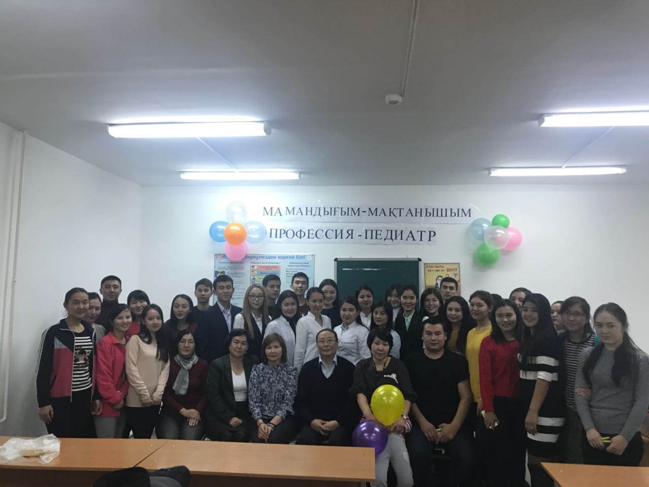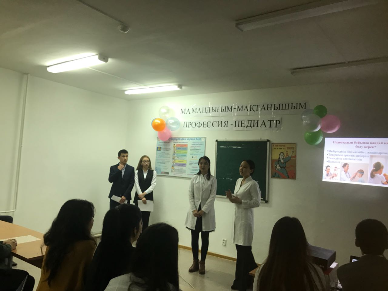 Воспитательный вечер проведен в рамках международного дня Педиатров и в программе были озвучены темы «Білікті педиатр – дені сау ұрпақтың кепілі» (студенты ЖМ-14-25-2 группы: Қарасаева Асель, Кунградова Азиза), «Ведущие педиатры РК» (студенты ЖМ-14-21-1 группы: Өскенбек Салтанат, Абдураим Актоты), «Этика и деонтология» (студенты ЖМ-13-32 группы: Сейдахан Жазира, Турсынкул Багдаулет) и фоновым патологиям детского возраста: «Рахит» (студенты ЖМ-13-32 группы Кенова Сагыныш, Молайханов, Шохмурад), «ЖДА» (студенты ЖМ-13-32 группы Тануарбек Улжан, Рахымжан Балауса), «Диатездер» (студенты ЖМ-13-32 группы Абдимомын Жулдыз, Ерланкызы Айдана). Для закрепления знаний фоновых заболеваний у детей студентами ЖМ-13-32 группы Абдикуловой Лаурой, Тажимбетовой Гульзадой, Амануллаевой Маржан, Куралбек Гаухар, Ускенбай Мадияр проведена викторина со включением обратной связи.