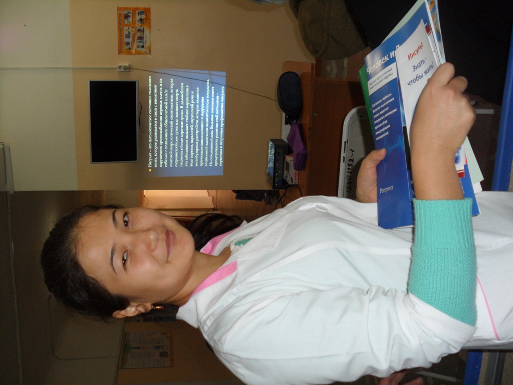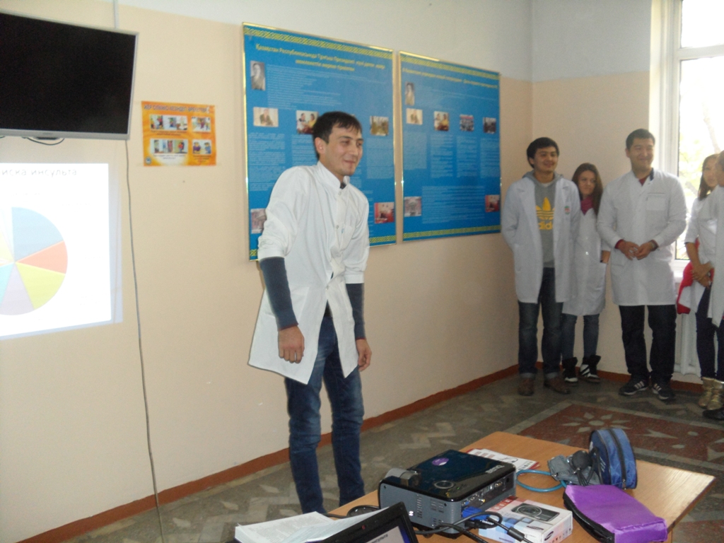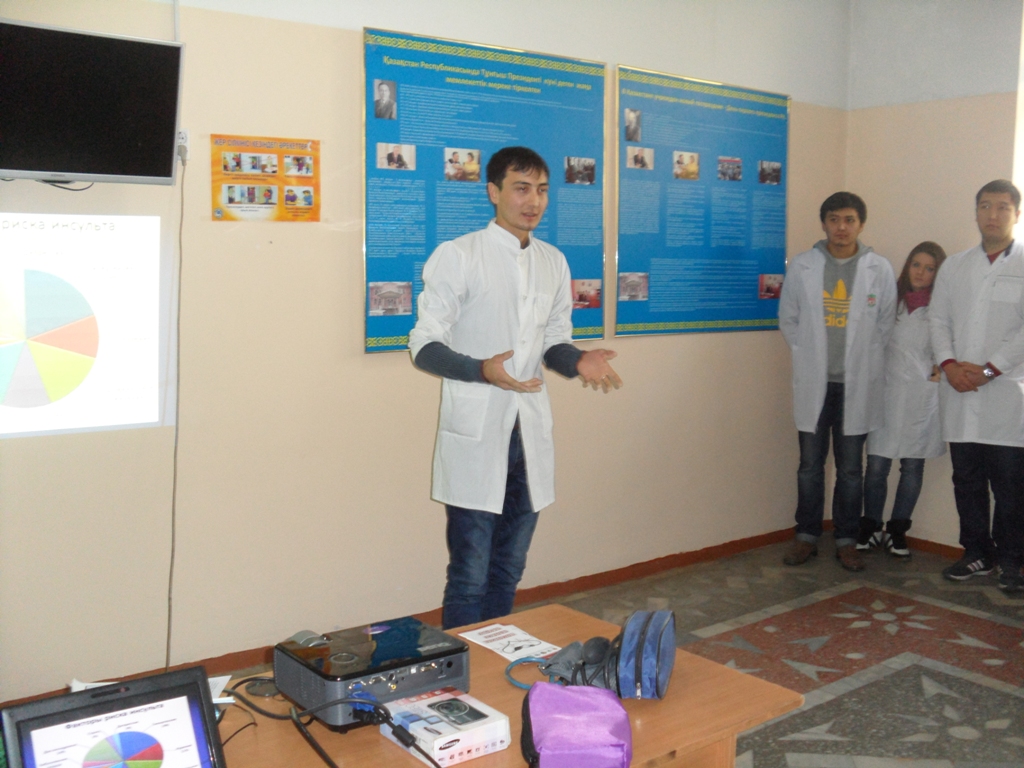 В проведении флеш-моба активное участие принимали все студенты, но особо отличились студенты 5 курса ОМ 34-1 (Артыкбаева Асем, Дауталиева Акбала, Жапар Құрбан) и 34-2 группы (Мұхтарова Гүлнұр), что представлено на рисунках 3-6. Студенты измеряли артериальное давление пациентам с артериальной гипертензией, читали лекции, беседовали с пациентами, а также раздавали больным брошюры по профилактике инсульта.