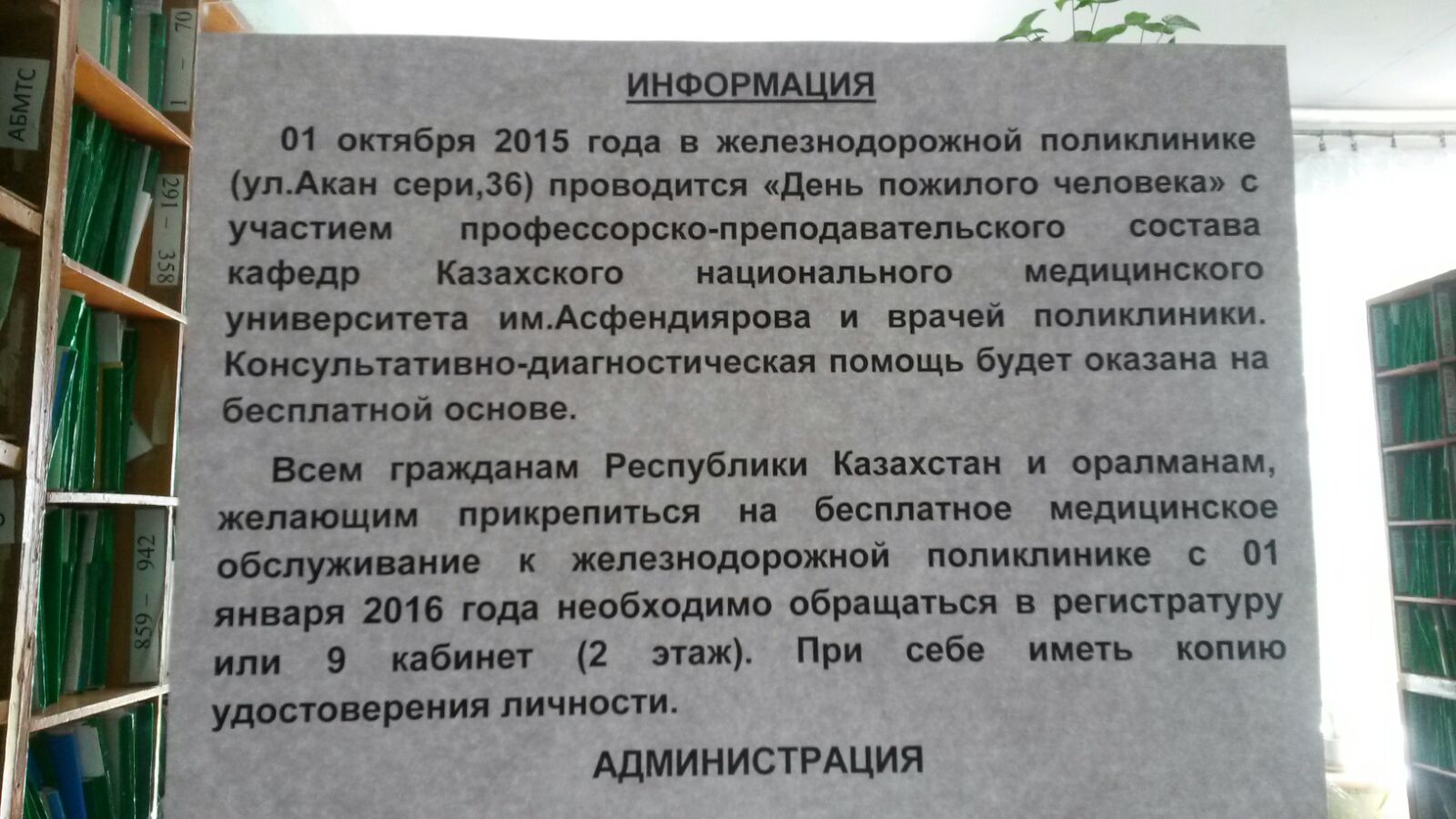 1 октября 2015 года сотрудниками кафедры пропедевтики внутренних болезней совместно с врачами поликлиники Алматинской Железнодорожной больницы была проведена благотворительная акция «День открытых дверей», посвященный Всемирному дню пожилого человека. Проводился прием всех желающих пациентов.
