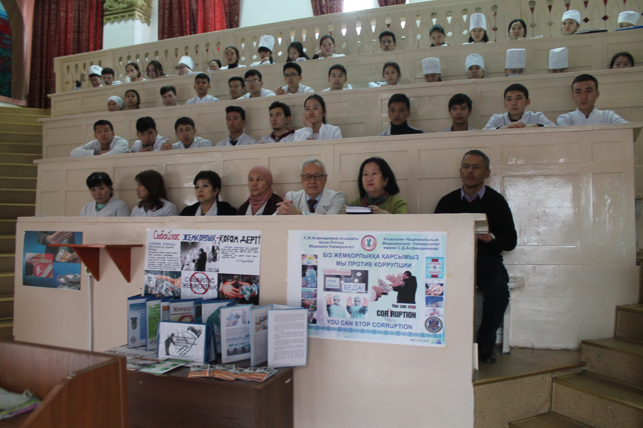 Сыбайлас жемқорлықпен күресуді негізге ала отырып, іс-шара өз бастамасын алған болатын. «Жемқорлыққа жол жоқ!» — дей отырып, беделді кісілерге сөз кезегі берілген болатын. Профессор Жанар Габиденовна өз сөзін «Жемқорлықпен күресу – этиканың бір түрі» деп бастады. Өзінің өмірлік тәжірибесімен бөлісе отырып, жемқорлыққа қарсы күресе білуді ұсынды. Жемқорлықты жаны сүймейтін Жанар Габиденовна апайымыз «Жемқорлықты жою – өзіміздің қолымызда. Сіз бен біз болып, осы жолда тер төгетін болсақ еліміздің келешегі жарқын болмақ. Алдағы уақытта жемқорлықты жою үшін күрес – еліміздің дамуына үлкен үлес қосар еді» деді. Жанар Габиденовна медицина саласында білім алып жүрген студенттерге дұрыс жол нұсқай отырып, сыбайлас жемқорлыққа қарсы күресуге шақырды. Осы тұрғыда «Қалыпты анатомия» кафедрасының оқытушылары да өз ойын ортаға сала кеткен болатын. Атап айтсақ, профессор Т.М.Досаев өз сөзінде жемқорлық орын алып жатқан жағдайда үнсіз қалмай, арнаулы орындарға хабар беру керектігін атап өтті. Конференция барысында жалпы медицина факультетінің 1 курс студенттері сыбайлас жемқорлыққа қарсы күрес бойынша баяндамалар оқыды. Студенттердің осы тұрғыда өз ойларын ортаға салып, өзгелердің ойына аз да болсын жемқорлықты жоюға ұмтылыс ұялатқаны қуантарлық жағдай. Сонымен қатар, «Сыбайлас жемқорлық» тақырыбында қойылым қойылды. Бұл қойылымның басты мақсаты: «Қанша жерден тығырыққа тірелсең де, өз ісіңе адал болуды, жемқорлыққа жол бермей, әділеттілікке шақыру. Конференция барысында сыбайлас жемқорлық жайында ой саларлық бейнероликтер мен терең мағыналы стендтер назарымызға ілінген болатын. Өз шегіне жеткен іс-шараның түпкі ойы қатысушыларға осы жолда күресуді мақсат етіп, үйрету болып табылады.