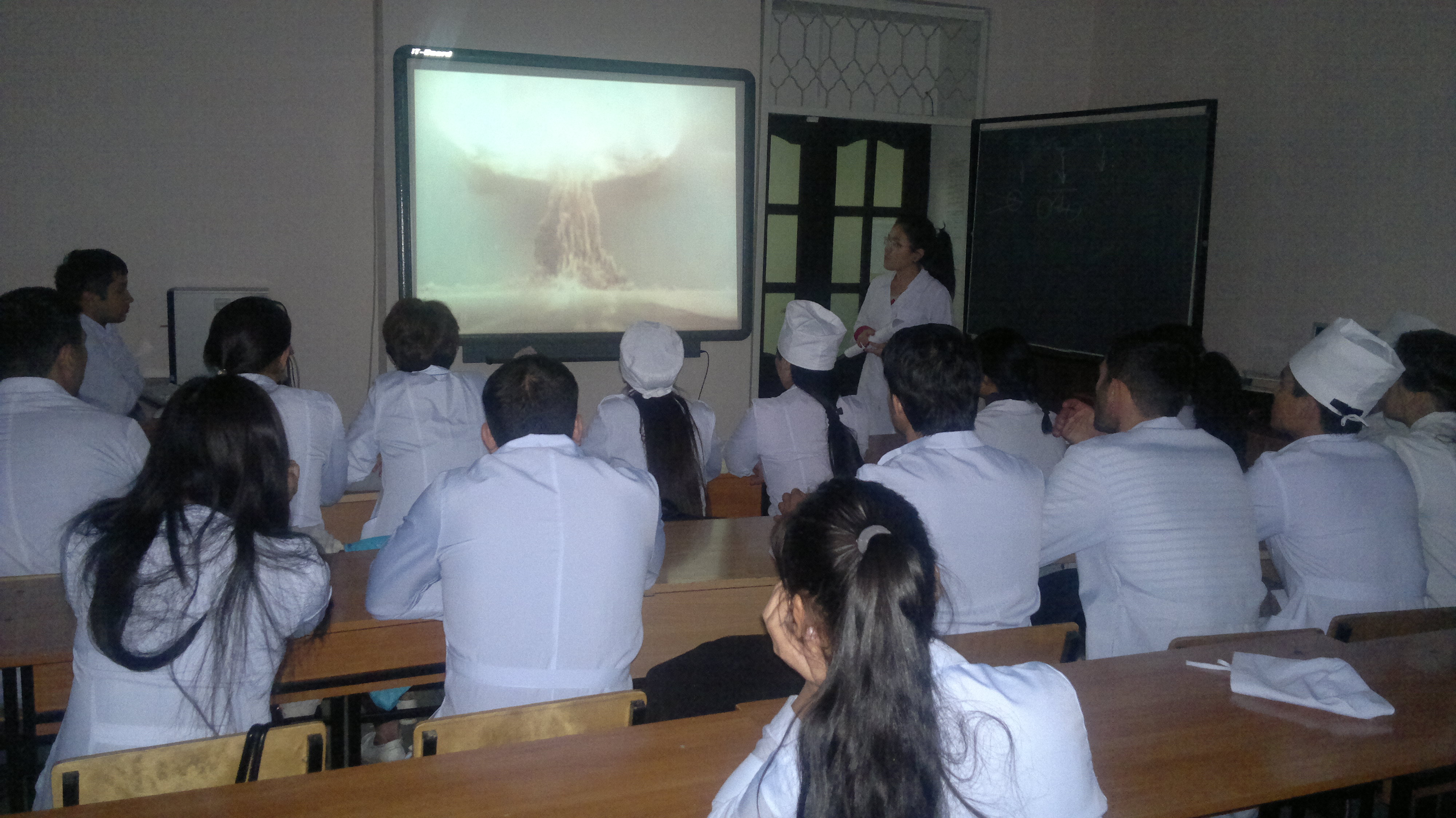Студенты 3 курса ОМ 12-035/2 группы Сағи М.С. и Оразаметов Д.М. подготовили доклад на тему: « Семипалатинский ядерный полигон»; Алдабергенова А.М. и Тутадзе А.М. подготовили доклад на тему: «Экологический фактор. Понятие экогенетики»; Баялиева З.А. и Вердина К.В. подготовили доклад на тему: «Последствия Семипалатинского полигона»