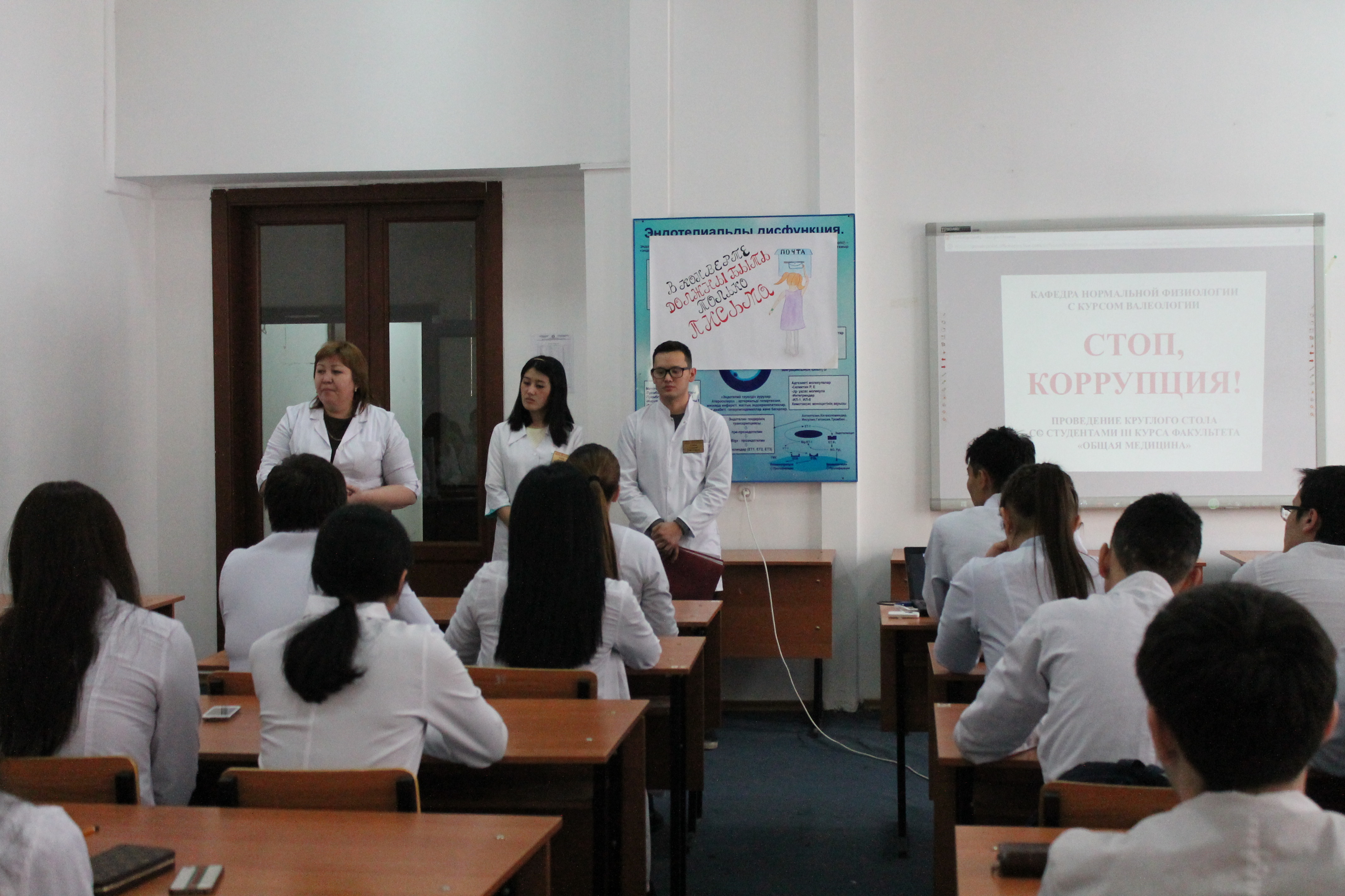 Студентами 14-028-02 группы III курса факультета «Общая медицина» под руководством ППС кафедры нормальной физиологии с курсом валеологии совместно с ППС кафедры патологической физиологии был организован и проведен круглый стол на тему: «Стоп, Коррупция!» (06 марта 2017 г.) в аудитории №18 с приглашением проректора по воспитательной работе Р.Т.Джумашевой, начальника управления по воспитательной и социальной работе М.Т.Султановой, декана факультета «Общая медицина» Г.А.Шопаевой, заместителя декана 4 курса Ж.Ж.Курмангалиевой, заместителей декана 3 курса С.Х.Наккажиной и Г.Н.Бейсегуловой.