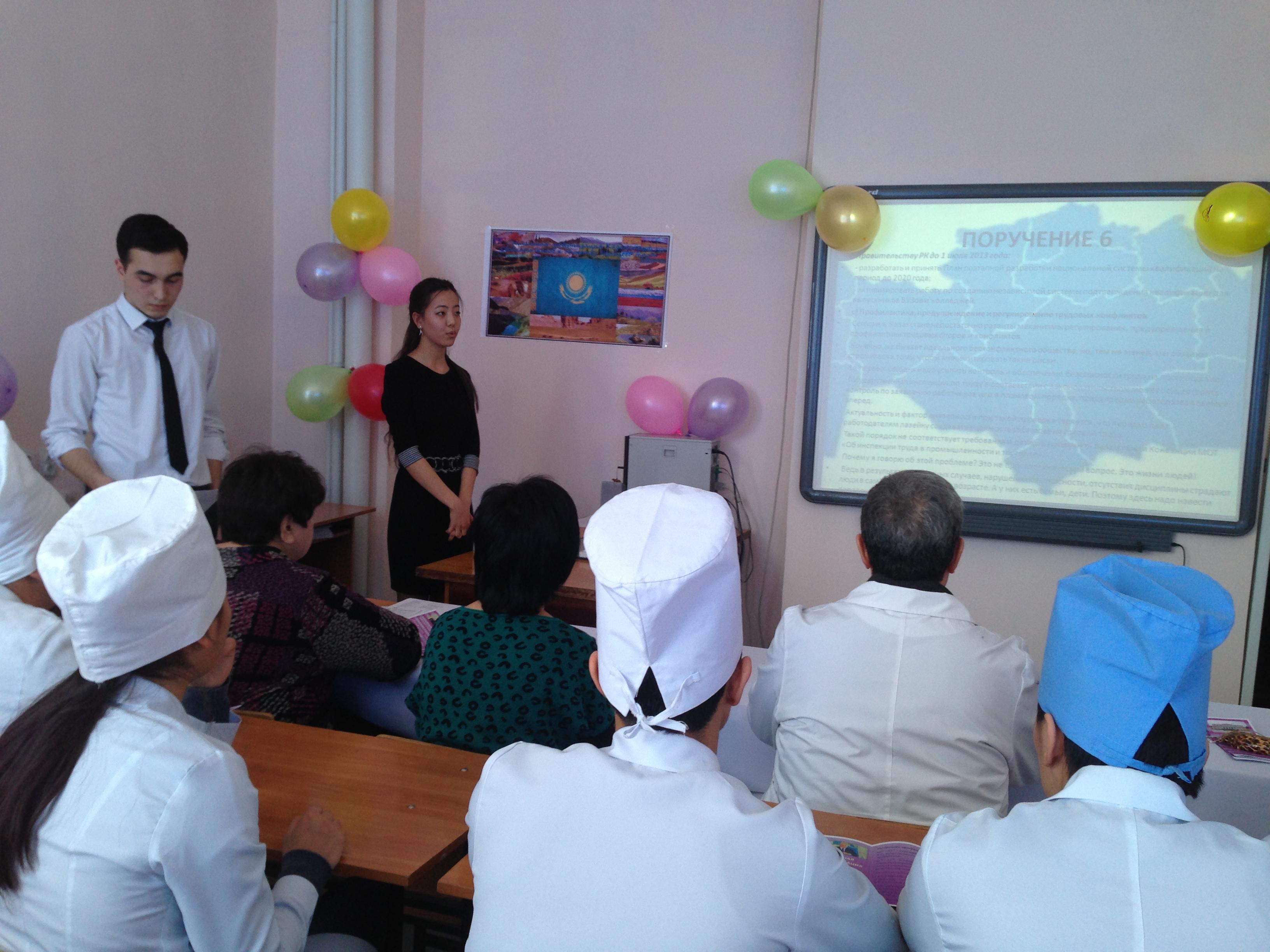 В КазНМУ им. С.Д. Асфендиярова проведен круглый стол на тему: «Социальная модернизация Казахстана: Двадцать шагов к Обществу Всеобщего Труда».  В организации мероприятия приняли участие преподаватели модуля нормальной анатомии (проф. Дюсембаева А.Т., ст.пр. Абилова А.А., преп. Сейфульдинова М.А.), студенты 3 курса и представители деканата Общая медицина. Участники встречи провели широкую общественную дискуссию по обсуждению положений статьи Главы государства. Студенты  перечислили и разъяснили все 20 поручений Президента страны, в которых четко и  конкретно Глава государства показал, что не стоит нашему обществу самообольщаться достигнутыми успехами, основная работа впереди. Все участники круглого стола подчеркнули, что Президент адресует свою программу, свой призыв в большей степени к молодежи как самой передовой и созидательной части общества и только  благодаря упорному труду и целеустремленности можно стать высокообразованным человеком и профессионалом своего дела.