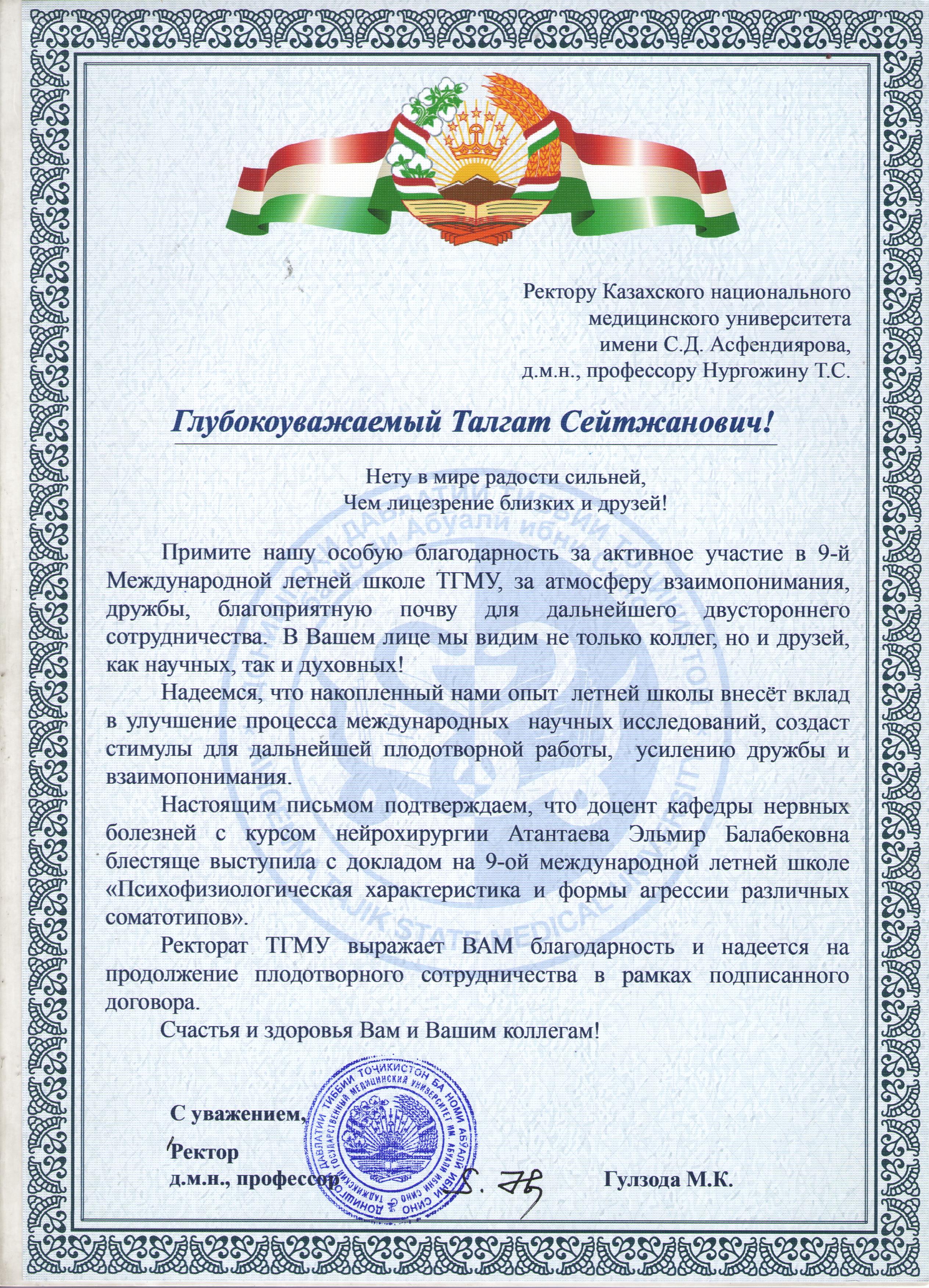 Таджикский Государственный Медицинский Университет имени А буали Ибн Сино ежегодно  проводит Международную летнюю школу.  В этом году Международная летняя школа ТГМУ-2019 «Психофизиологическая характеристика и формы агрессии различных соматотипов» состоялась с 15 по 25 июля с участием преподавателей и студентов  медицинских университетов разных стран. Из Казахстана участвовали Медицинский Университет Астаны, Медицинский Университет Караганды и КазНМУ имени Асфендиярова. Наш университет впервые принял участие, а именно кафедра нервных болезней с курсом нейрохирургии,  в лице доцента этой кафедры, к.м.н Атантаевой Э.Б., которая достойно представила КазНМУ.  Участники выступали с научными докладами,  участвовали в дискуссиях, делились своим опытом.  Помимо рабочей части летней школы в программу были включены экскурсии, походы в горы, посещение святых мест и достопримечательностей, поездки в несколько городов Таджикистана, вечера дружбы, концерт от ансамбля «Шифо».  Незабываемо тепло и гостепреимство, дружелюбие и открытость организаторов летней школы. Красота Душанбе и Таджикских пейзажей с богатой историей останется в душе навсегда.  Выражаем глубокую благодарность ректору ТГМУ профессору Гулзода М.К. ,  а также основателю летней школы профессору Шукурову Ф.А. и всем организаторам.  Руководство ТГМУ презентовало проспект своего универститета и благодарственное письмо ректору КазНМУ Нургожину Т.С. за активное участие в 9-й Международной летней школе ТГМУ, за атмосферу взаимопонимания,  дружбы,  за благоприятную почву для дальнейшего двустороннего сотрудничества,  также  в письме отмечено, что доцент кафедры нервных болезней с курсом нейрохирургии Атантаева Э. Б. блестяще выступила с докладом.  Данная летняя школа станет началом плодотворного сотрудничества между нашими вузами.