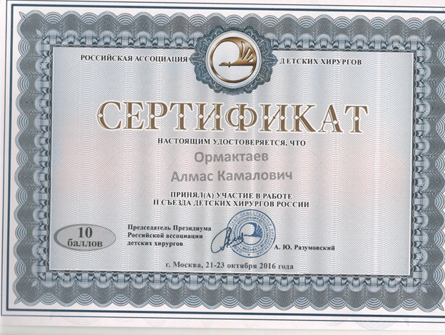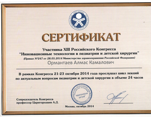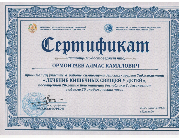- Мастер-класс «Эндовидеохирургия детского возраста» (г.Москва, Россия, профессор РГМУ Разумовский А.Ю.). УК «Аксай», КазНМУ, Алматы, 2014 г.