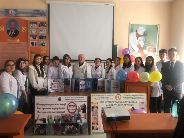 2018-2019 оқу жылындағы «Қалыпты физиология» кафедрасыныда сыбайлас жемқорлыққа қарсы кеңесінің ұйымдастыруымен «Біздің таңдауымыз жемқорлықсыз болашақ!» атты іс-шара мектеп деңгейінде өткізілді. Іс-шараға «Қалыпты физиология» кафедрасының меңгерушісі Ш.О. Рыспекова, кафедра профессоры А.Д. Соколов, Жалпы медицина мектебінің деканы Г.А. Шопаева, жалпы медицина мектебінің орынбасары Ж.Б.Садық шақырылды. Кафедраның аға оқытушысы Б.А.Джусипбекова, оқытушылар К.К. Мусина, Г.М. Айтжанова. Іс-шараға кафедраның профессорлық-оқытушылық құрамы мен жалпы медицина мектебі және халықаралық медицина факультетінің 1 курс студенттері қатысты. Іс-шараны 1 курс студенті А.Қанатов «Адай» күйімен ашты. Алғашқы сөз кафедра профессоры А.Д.Соколовқа берілді. Профессор Соколов студенттерге кафедраның сыбайлас жемқорлыққа қарсы кеңесі жұмысы жөнінде мағлұмат бере отырып, жас ұрпақты жемқорлықсыз болашаққа жетелейтін жолдардан таймауды ұсынды. Жалпы медицина мектебінің 1 курс студенттері Н.Омірзакова, А.Мейрбек, А.Жали «Жемқорлық-індет,жою-міндет!» атты тақырыбына үш тілде баяндамаларын жасады. Баяндамада жемқорлық және оның зардаптары көрсетілді. «Жемқорлық және медицина» тақырыбына осы мектептің 1 курс студенттері А.Қанатов, Ж.Әдехан,Е.Қуандықовтың орындауында жасалған бейнероликтері көрсетілді. 1-курс студенттері А.Мейрбек пен Н.Омірзакова жемқорлықпен күресті өлең жолдарымен жеткізді. «Жемқорлықпен күрес-басты міндет» тақырыбында түрлі буклеттер дайындалды. «Жемқорлық» тақырыбында халықаралық медицина мектебінің ағылшын бөлімінің студенттері А.Чаударри мен М.Рақымжанов өз баяндамаларын ұсынды, баяндамада басты назар жемқорлықпен күрес жолына қойылған.