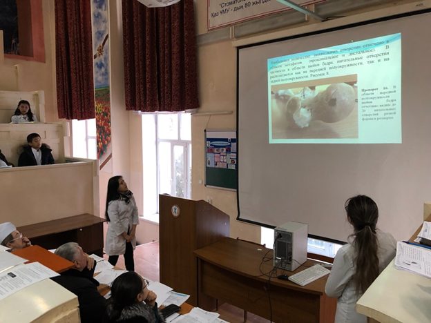 В начале конкурса были избраны члены жюри по определению призовых мест. В состав жюри вошли: Профессор Романюк С.Н., доцент Шакенов Б.Ш. студентка Кайшыбай Акеркем  3 курса ОМФ  председатель научного кружка «Анатом». Жюри по определению призовых мест руководствовался Положением о НИРС. Алматы-2013г. Стр.17. Положение 3. «Критерий оценок научных работ на 1-м и 2-м туре конкурса НИРС».  Во время доклада и по окончанию докладов, студентам были заданы различные вопросы, на которые они достойно отвечали , что доказывало об их хорошей подготовленности.  Следует  отметить  хорошее знание английского языка студентами: Сокольской В., 1 курс ОМФ, группа 18—024-01. Куанышбаевой  А. 1 курс ОМФ, группа 18—005-02. Артиковой  О.  2 курс, ОМФ. группа 17-015-1 .