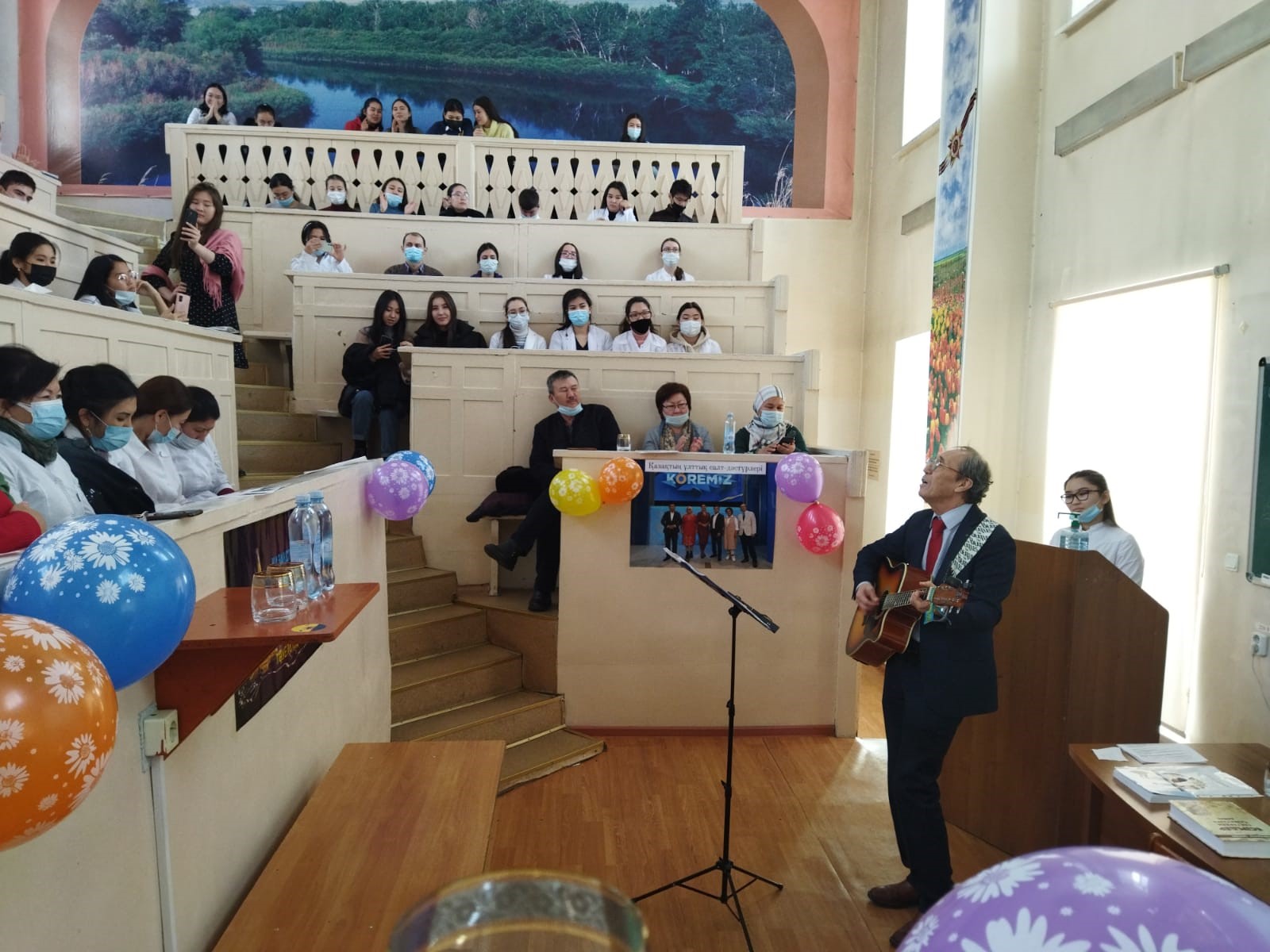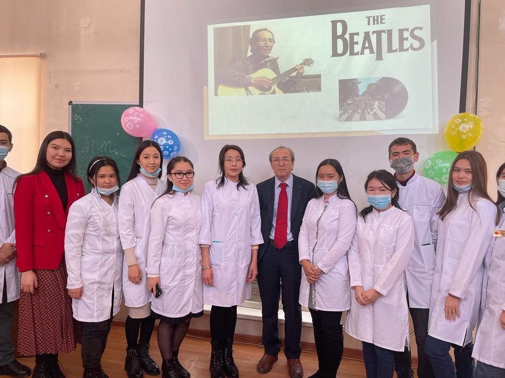 On November 20, 2021, Auditorium # 1 at 10.00 o’clock held a round table dedicated to the 30th anniversary of the Independence of the Republic of Kazakhstan on the topic “Belgili madeniettanushi Berdaly Ospanny dara Zholy”, organized by Professor Dyusembaeva A.T., lecturers Baigamysova D.S. and Abiyrova N.B. The event was opened with introductory words by Professor Dyusembaeva Asya Tulebaevna. The teaching staff of the department took part in the round table (Akhmad N.S., Baigamysova D.S., Iskindirova A.M., Iskakova L.A., Tukibaev Zh.A., Abiyrova N.B., Balapanova A.A., Musina M.S., Syzdykov D.M., Alzhanbekova G.T., Okhanova M.I., Abilova A.A. Tolkyn Kadyrzhanovna) and students of the department of curatorial groups of the 2nd year of the Faculty of General Medicine and the 2nd year of the Faculty of Pediatrics. At the beginning, Berdali Yesimkhanuly told about himself, his family, about his books, about creativity, about participation in the World Festival of the Beatles in England, which took place in the city of Liverpool, in 1994. Photos were shown, about his own drawings and between stories were performed Beatles songs on guitar in English and own translation of Beatles songs in Kazakh. The event was held at a high level, questions were asked by students and teachers of the department, and also songs and dances were performed by students for our guest.