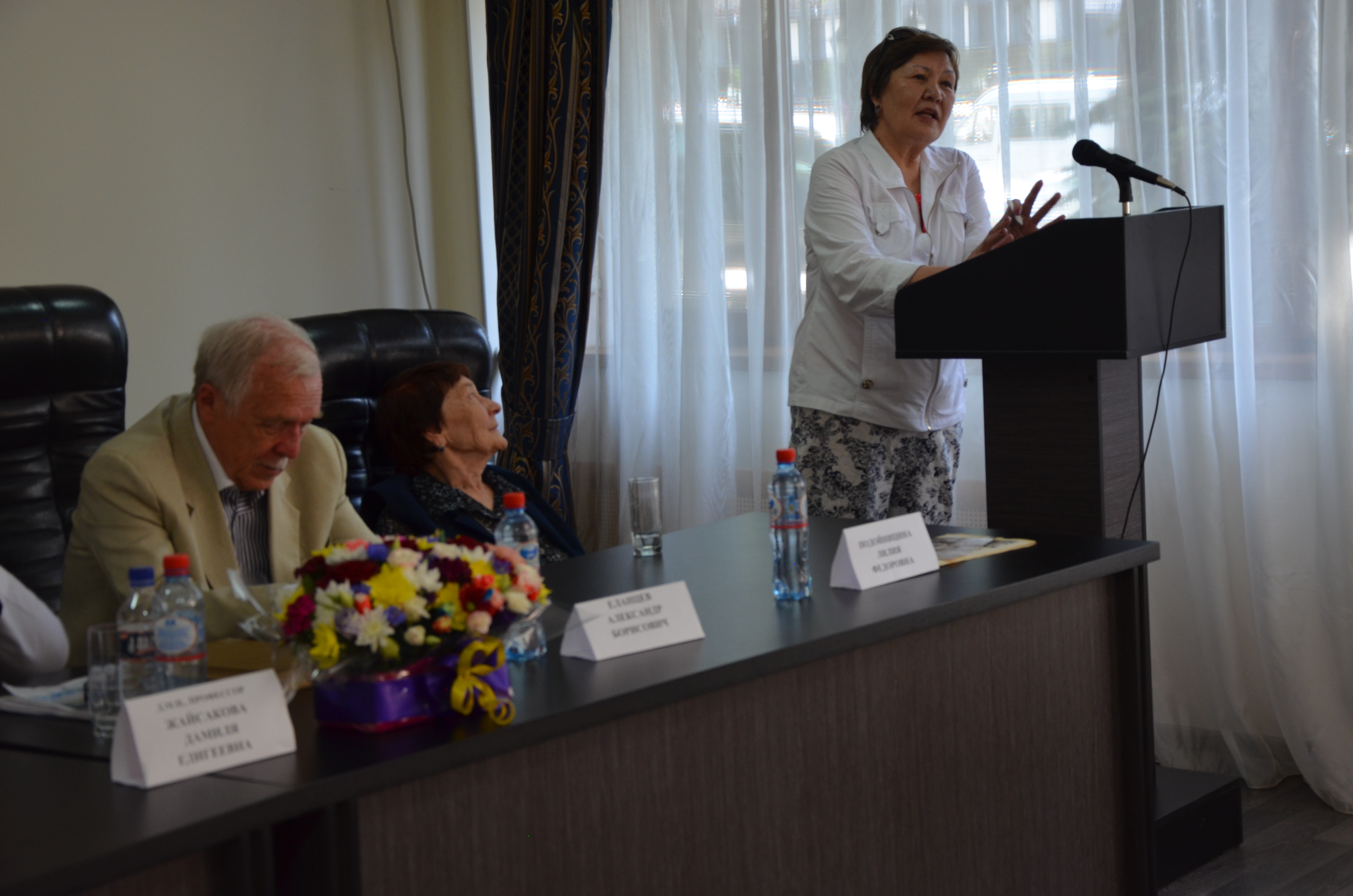 КСФ сказала: От имени нашей конференции позвольте поблагодарить профессора Баймаканову Софью Шакировну. От души пожелать ей доброго здоровья, энергии, спасибо за тёплые слова, сказанные в адрес профессора Еланцева Б.В.