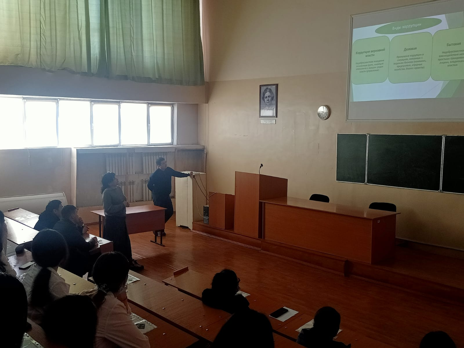 Заведующая кафедрой «Медицинское право» Богатырева Л. Б. рассказала студентам о том, какую правовую ответственность несет каждый человек за коррупционные преступления. Она подчеркнула что основной целью закона — «О противодействии коррупции» является регулирование общественных отношений в сфере противодействия коррупции и реализация антикоррупционной политики в Республике Казахстан. Лидия Башировна представила информацию, о том, как индекс восприятия коррупции составляется международной непровительственной организацией Transparency International с целью демонстрации оценки уровня восприятия коррупции аналитиками.