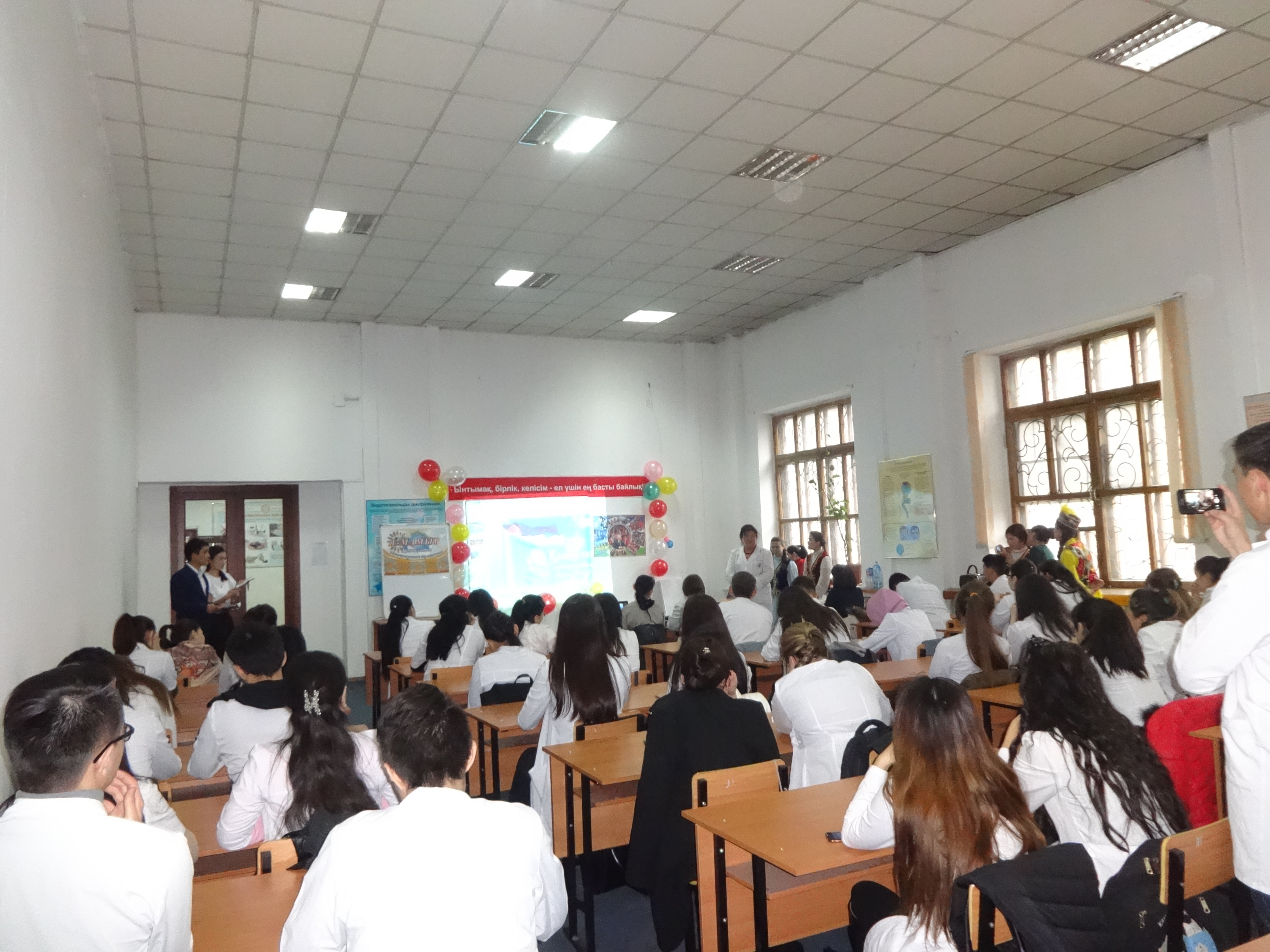 Студентами 14-019-02 группы III курса факультета «Общая медицина» под руководством ППС кафедры нормальной физиологии с курсом валеологии совместно с ППС кафедры фармакологии было организовано и проведено мероприятие, посвященное празднику 1 мая «Ынтымақ, бірлік, келісім – ел үшін ең басты байлық» (04 апреля 2017 г.) в аудитории №18 с приглашением проректора по воспитательной работе Р.Т.Джумашевой, начальника управления по воспитательной и социальной работе М.Т.Султановой, декана факультета «Общая медицина» Г.А.Шопаевой, заместителя декана 4 курса Ж.Ж.Курмангалиевой, заместителей декана 3 курса С.Х.Наккажиной и Г.Н.Бейсегуловой. Ответственные за мероприятие и студенты 14-019-02 группы III курса факультета «Общая медицина» обратили внимание студентов на формирование дружеских отношений между студентами; воспитывать у студентов уважение к культурам, историческому прошлому и наследию народов, проживающих в Казахстане; формирование у студентов казахстанского патриотизма посредством культурного наследия народов Казахстана, что и явилось целью проведенного вечера.