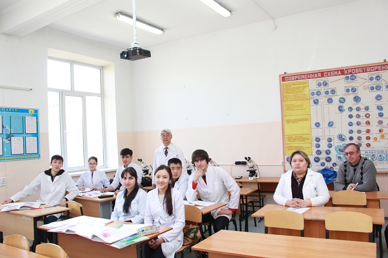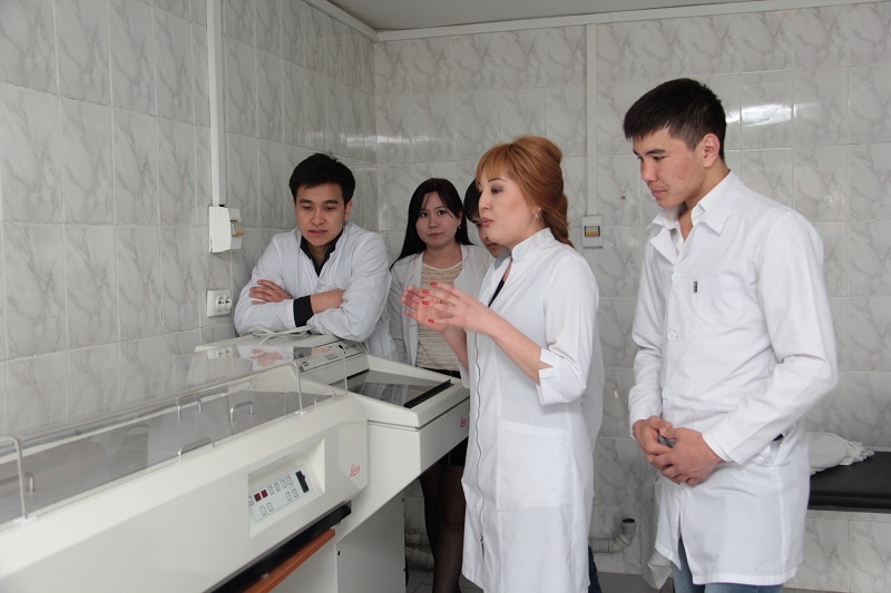 В 10 часов зав. кафедрой доц. М.Ж.Ергазина провела экскурсию по кафедре гистологии, при этом особое внимание было уделено гистологической лаборатории, компьютерному классу, учебным комнатам с интерактивной доской и с мультиголовочным консультационным микроскопом.