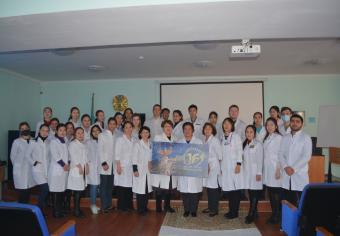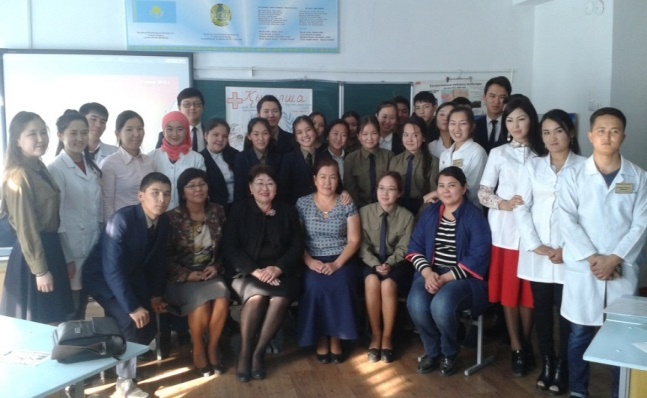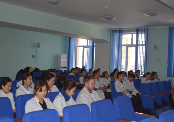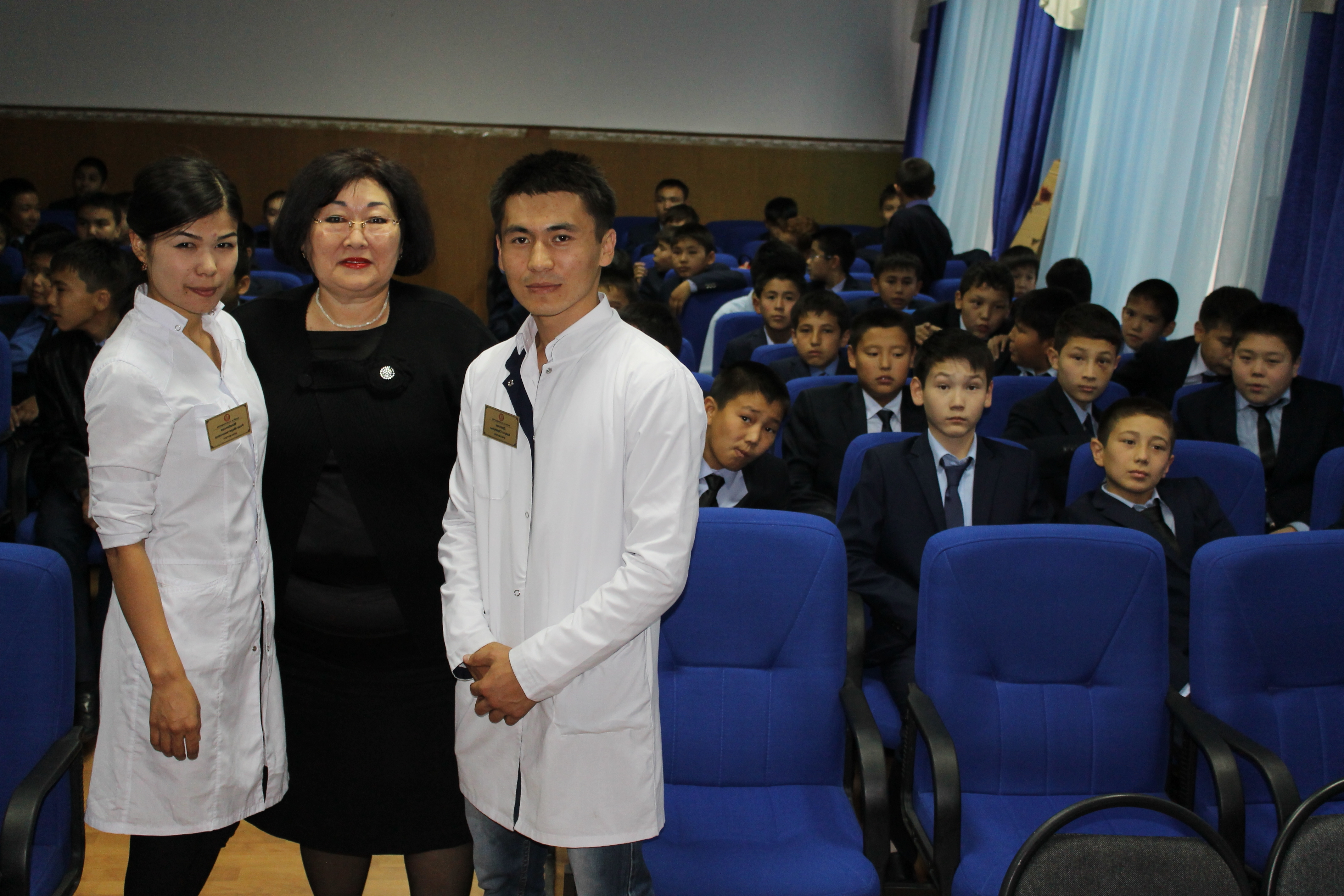 03/01/2016, the interns of 610 gr., Studying in the state language (the head of the Assoc. Prof. Ospanbekova N.К.) gave a lecture at the Almaty Industrial College on the topic:  “Diagnosis, treatment and prevention of influenza and ARVI.”