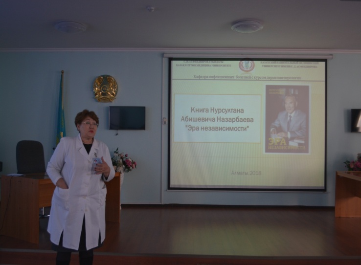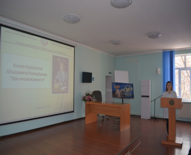 15.11.2018 in the conference hall of GIKB of I.S. Zhekenova the Round table on a subject was carried out: “An era independence”, devoted to discussion of the book of Elbasa, the Leader Nation of N. Nazarbayev. Students of OHMS of the 5th course of group 31(1.2), 32(1.2), 43(1.2), 44(1.2) and the staff of department participated in discussion. Made an opening speech the associate professor, responsible for educational work of Ospanbekov N.K.She noted importance of the book of N. Nazarbayev as взгяд on achievements and mistakes for years of independence of the first person and plans for the future.