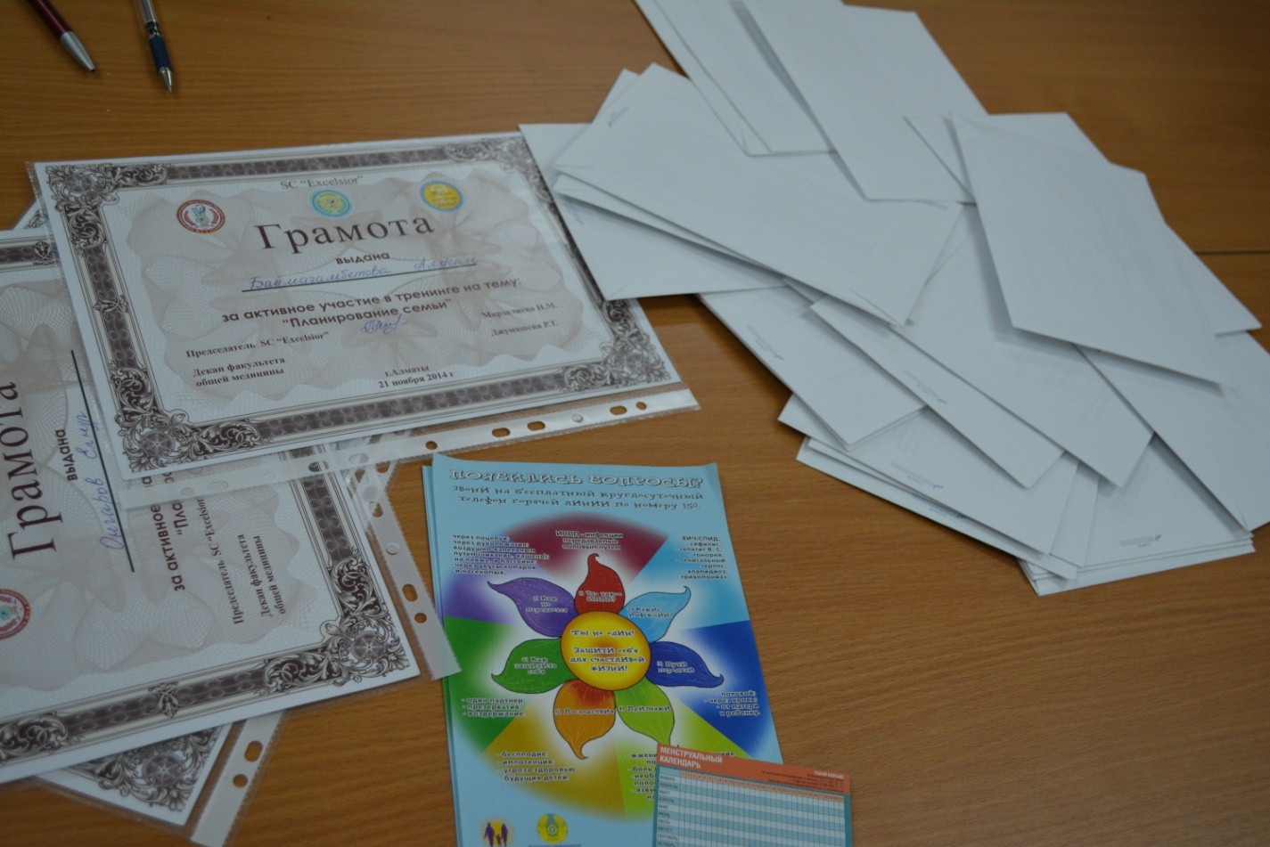 2014 жылдың 21 қарашасында жалпы медицина факультетініңScience club “Excelsior” тобымен бірінші курс студенттері үшін №2 жатақханада «Отбасын жоспарлау» тақырыбында  семинар-тренинг өткізілді.Семинар-тренингте әйел адам мен ер адамның репродуктивті жүйесінің ерекшеліктері, жастардың репродуктивті мінез-құлқы, қазіргі заманғы контрацепция түрлері, отбасын жоспарлаудың өзекті мәселелері  сияқты сұрақтар талқыланды.Семинар- тренинг барысында видеороликтер көрсетіліп, студенттерге ақпаратпен қамтылған ескертпе қағаздары таратылды. Сонымен қатар түрлі клиникалық жағдайлық есептер шешу барысында, студенттер арасында пiкiрталас туғызды. Аталған шара натижесінде, студенттер келешекте отбасын құру және оны жоспарлауда түрлі ақпараттар алды деген ойдамыз. Белсендіқатысқанстуденттергемарапаттауқағазыұсынылды.