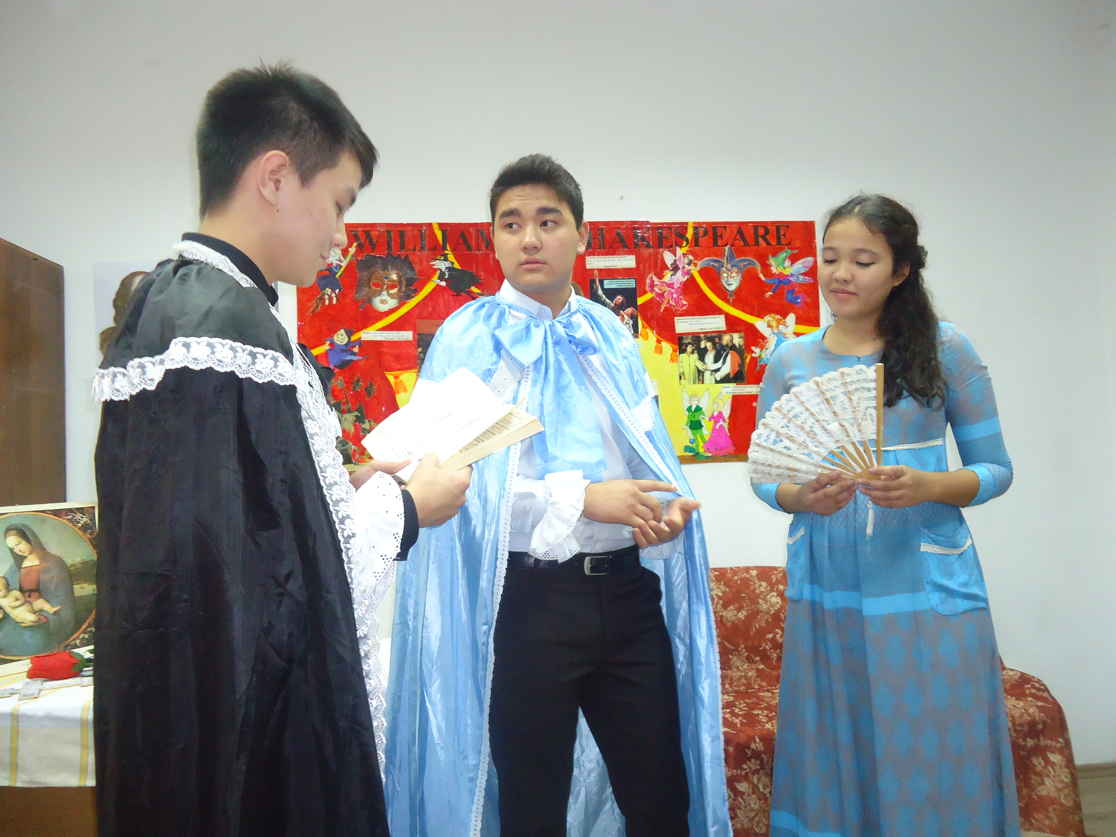 Әдеби- кеште студенттер В. Шекспирдің әйгілі трагедиялары мен комедияларынан үзінді көрсетті: «Макбет», «Рамео және Джульетта», «Жазғы күнгі түс» онымен қатар №130, 154 сонеталарын оқыды.
