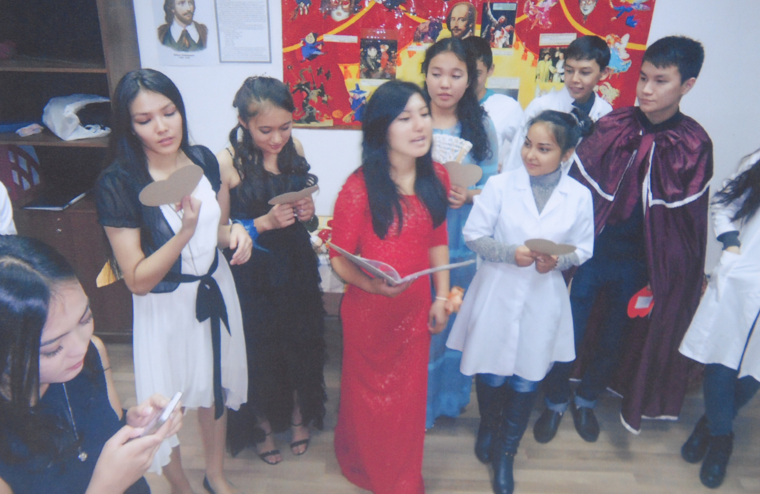 Қойылымның қатысушылары оқытушылармен бірге бөлмені жабдықтап және қажетті костюмдер мен реквизиттерді бірге дайындады.Әдеби кеш барысында қойылымның қатысушылары 50 түсірілім жасады.
