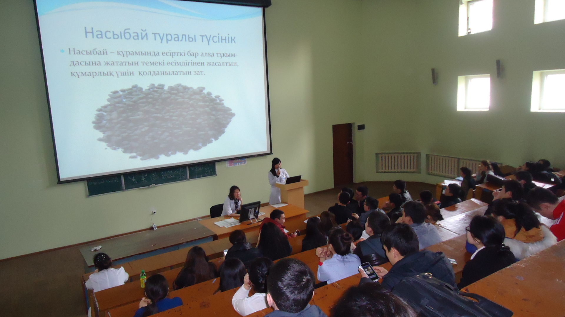 По плану воспитательной работы  студенты, обучающиеся на цикле «Пульмонология» кафедры внутренних болезней № 4 самостоятельно готовят сообщения о вреде привычек курения и употребления насвая. С самыми лучшими из этих работ они выступают перед своими сверстниками в других высших учебных заведениях города. Так, 13 марта 2014г. совместно со старшим наставником ассистентом Шишкаевой Д.С. студенты  5 курса 046-1 группы  Әлібаева Анар и  Искакова Назерке выступили в КазНТУ им. К. Сатпаева, а 14 марта  студенты 4 курса 050-1 группы  Джолдыбаева Айжан –  в КазНУ им.Аль-Фараби на  факультете журналистики с ответственным по воспитательной работе стажером-преподавателем  Жамировой Р.Н.  Отличное знание материала сопровождаемое  показом  короткометражных социальных роликов вызвало активную дискуссию  у их сверстников.