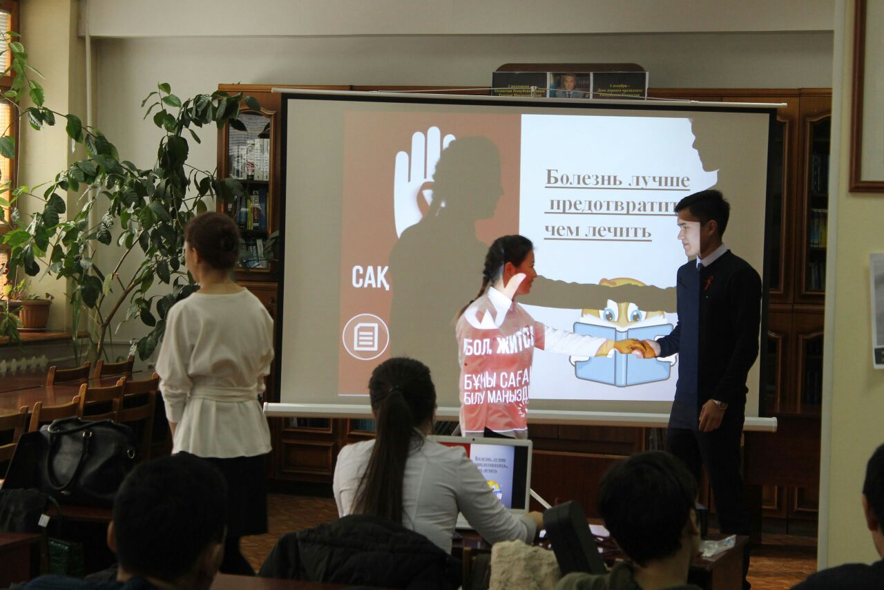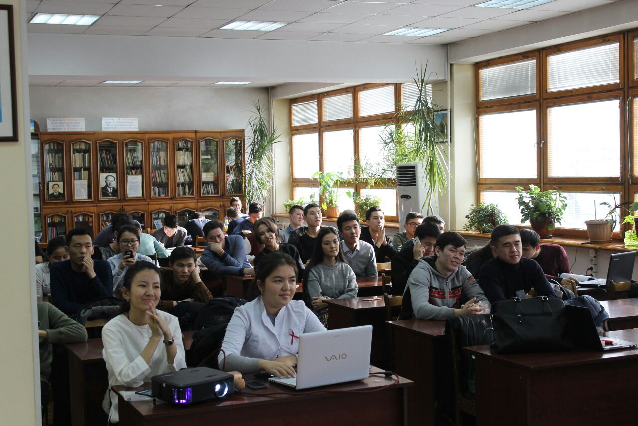 Желтоқсан айының сегізінші жұлдызында біздің университетіміздің Жалпы медицина факультетінің 5-курс студенттері,13-009-1 және 13-012-1 топтарының ұйымдастыруымен (топқа жауапты Жүйке аурулары кафедрасының профессоры Туруспекова С.Т.)Алматы Энергетика және Байланыс университетінде «ЖИТС: қорқу қажет емес,білу қажет!» атты тақырыпта шара өткізілді. Ондағы мақсат жастарды ЖИТС-тің қауіптілік деңгейін,одан қалай сақтану және алдын алу керектігі жөнінде кеңінен ақпараттандыру.Бұл шара екі бөлімнен тұрды. Бірінші бөлімде медицина студенттері ВИЧ инфекциясы қазіргі таңдағы өте өзекті мәселердің бірі екендігін,толық анықтама беріп кететін болсақ-адамның иммунтапшылығының нәтижесінде дамитын вирус болып табылады,иммундық жүйені біртіндеп зақымдайды,ол тек адам ағзасында ғана өмір сүреді және ұзақ жылдар бойы.Ағзаның инфекцияға қарсыласу күші төмендеп, адамда өте сирек кездесетін инфекциялық аурулар дамиды.ЖИТС ВИЧ инфекциясы дамуының ең соңғы деңгейі екендігі жөнінде мағлұмат беру,сонымен қатар ЖИТС ауруының пайда болу тарихы туралы,елімізде қашан тіркелгендігі жөнінде,оның таралуы,жұғу жолдары,және алдын алуы,қалай қорғануға болатындығы жөнінде жастарды барынша жоғары деңгейде ақпараттандыруға тырысты. Және аудиториямен тығыз байланыс орнатылды,викториналық сұрақтар қойылды,ЖИТС туралы не білетіндіктері жөнінде сауалнамалар таратылды.Тыңдалымға қатысқан Алматы Энергетика және Байланыс университетінің студенттері қойылған сұрақтарға жауап беруде барынша белсенділік танытты,олар да өз білгендерін ортаға салды,білмеген сұрақтарына да жауап алуға тырысты.Соңына таман медицина студенттері дайындаған брошюралар таратылды,ол арқылы да жастар өздеріне керекті кеңестер ала алады деген мақсатпен.Ал екінші бөлім студенттерді сергіту мақсатында театрлық скечтермен,сюжеттік жағдайлық есептермен және концерттік нөмірлермен толықты.Әрине тақырыптан тыс емес,негізгі тақырыптың аясында,яғни ВИЧ инфекциясының үш жұғу жолын, жүктілік кезінде анадан балаға,сақтанбаған жыныстық қатынас және емдеу мекемелерінде залалсыздандырылмаған шприц арқылы жұқтырылған үш тағдыр көріністе баяндалды. Домбыра шертілді,ән шырқалды.Бұл қойылған шарада медицина студенттері қазіргі заманның өзекті мәселесін жан-жақты көрсете білді , және жастардың санасына кішкене болсада сіңірілді деген ойдамыз.