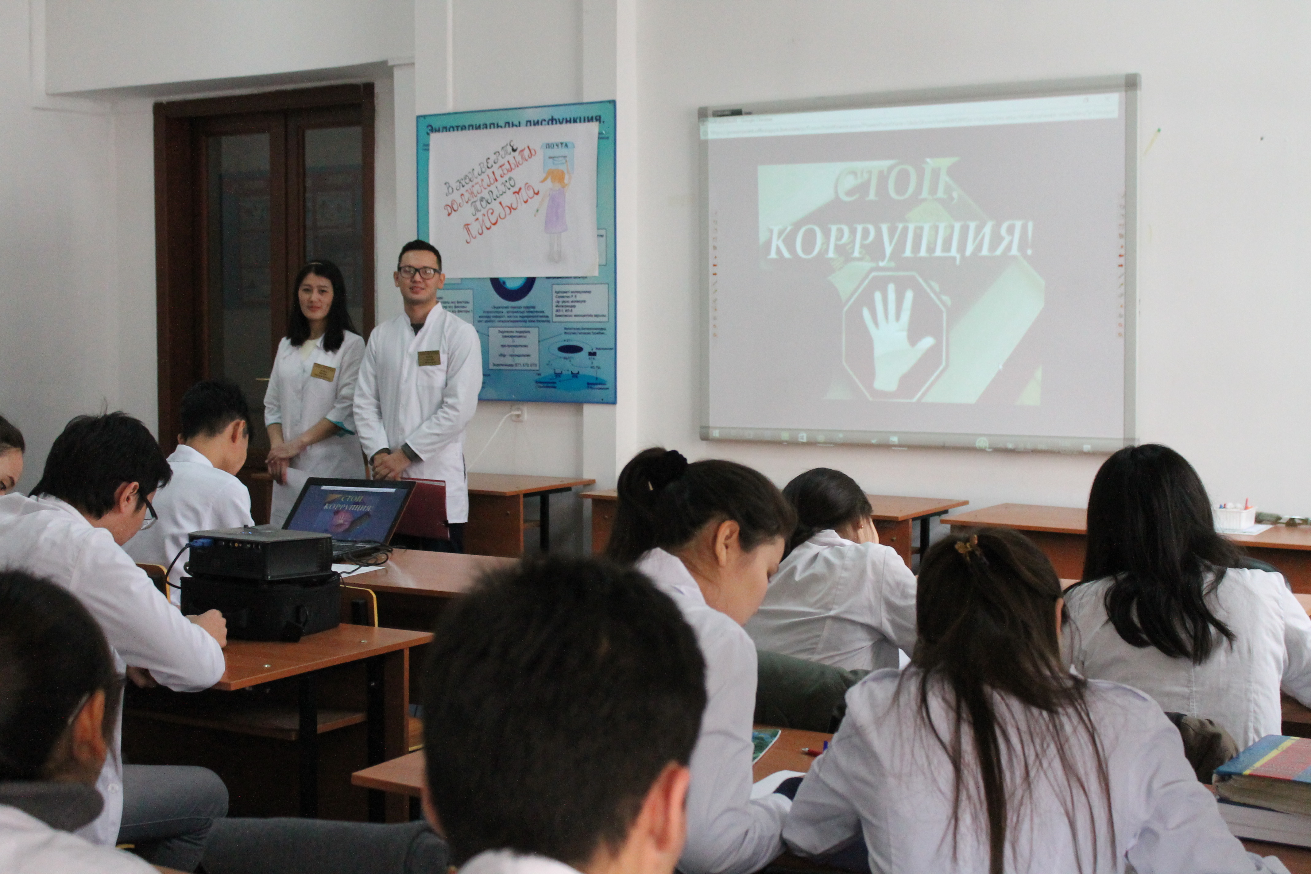 Студентами 14-028-02 группы III курса факультета «Общая медицина» под руководством ППС кафедры нормальной физиологии с курсом валеологии совместно с ППС кафедры патологической физиологии был организован и проведен круглый стол на тему: «Стоп, Коррупция!» (06 марта 2017 г.) в аудитории №18 с приглашением проректора по воспитательной работе Р.Т.Джумашевой, начальника управления по воспитательной и социальной работе М.Т.Султановой, декана факультета «Общая медицина» Г.А.Шопаевой, заместителя декана 4 курса Ж.Ж.Курмангалиевой, заместителей декана 3 курса С.Х.Наккажиной и Г.Н.Бейсегуловой.
