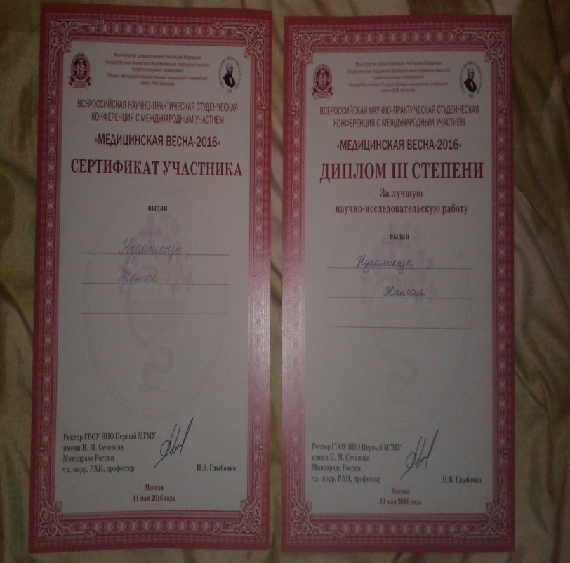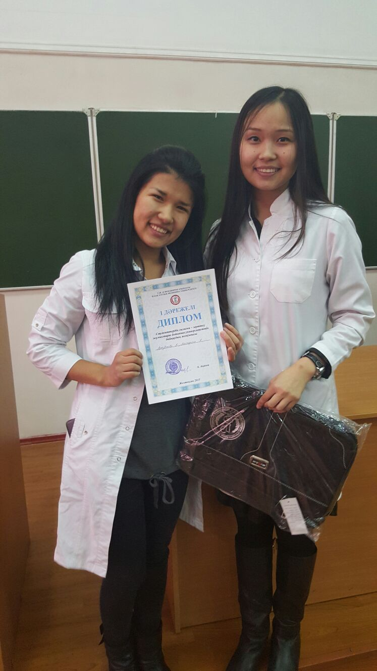 A fourth-year student of the Faculty of General Medicine, A. Shapiyeva, made a presentation entitled “Analysis of KazNMU students’ awareness of tick-borne encephalitis ”and received the 3rd place (scientific director Yegemberdieva R.A.). The intern of the 1st year of study of the faculty of General Medicine in the direction of training Internal Diseases Nursay Zhansaya made a presentation on the clinical and epidemiological characteristics of measles among students of the KazNMU named after S. Asfendiyarov was nominated for the Audience Award nomination. With the same report Nuruliyzy Zhansaya took part in the All-Russian Scientific and Practical Student Conference with international participation “Medical Spring-2016” in Moscow, and was awarded the diploma “For the Best Research Work” (supervisor – associate professor Sadykova A.M. ).
