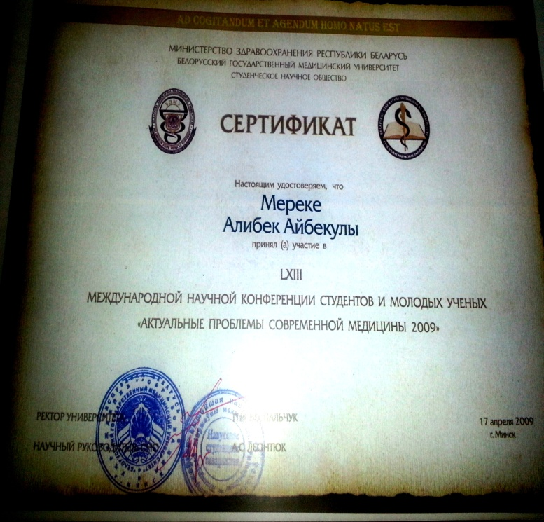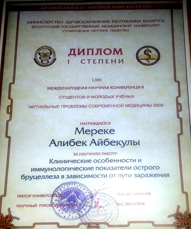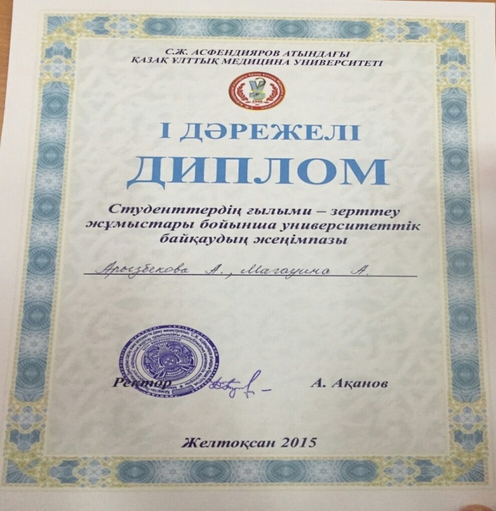 Residents 2 years of study AbubakirovaAidana, ArintaiTansholpan, Sultan Fariza, participated in the remote international conference International Scientic and Practical Conference “Methodology of Modern Research” March 31, 2018, Dubai, UAE on the topic The clinical features of salmonellosis caused by salmonella of rare groupsand awarded a diploma (supervisor – Associate Sadykova AM IV