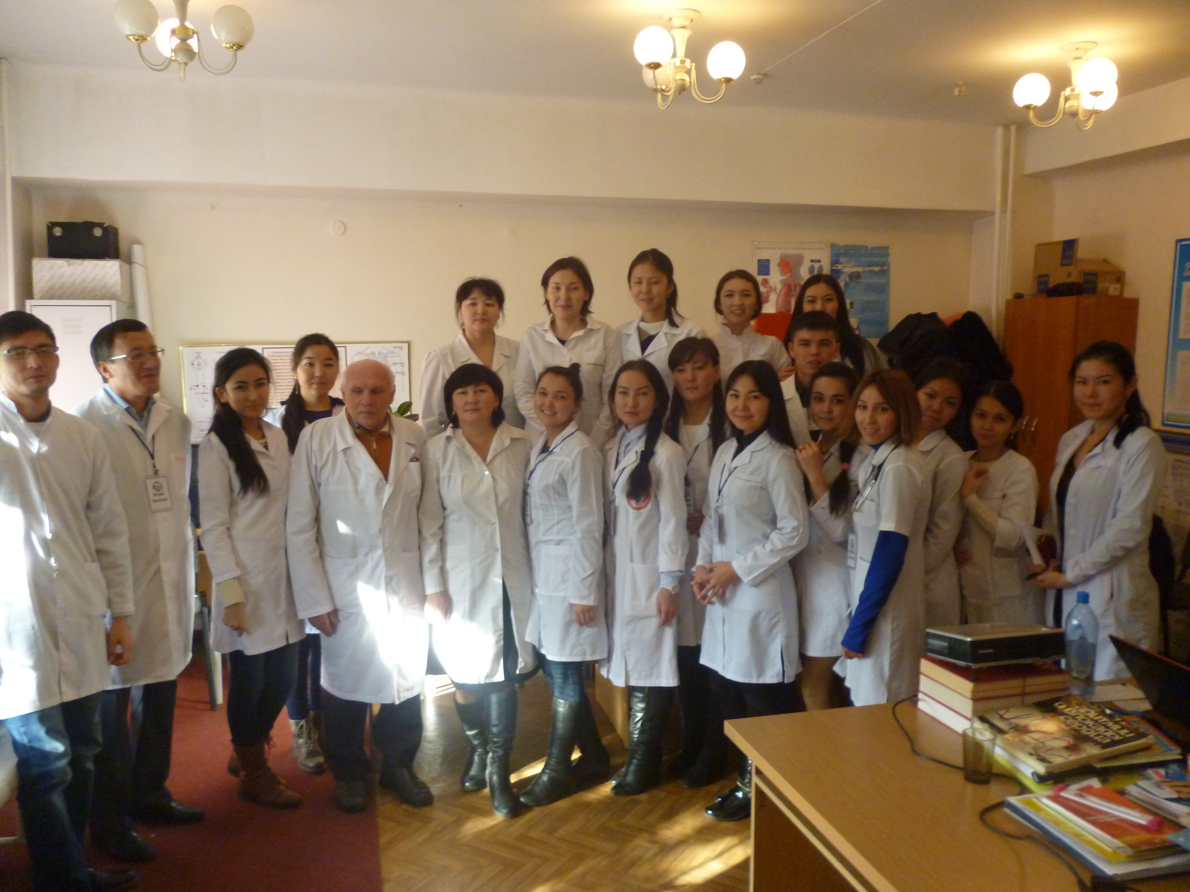 Prof.Akhmetova G.D. – Head of the Supervisory Board of the SUE at the EM AMEC. Assoc. Almukhambetov M.K. member of the Personnel Council at the AMEC. Assistant Turlanova A.K. is an expert doctor at the WW II polyclinic. The assistants of the department are members of the methodological bureau at AMEC substations.