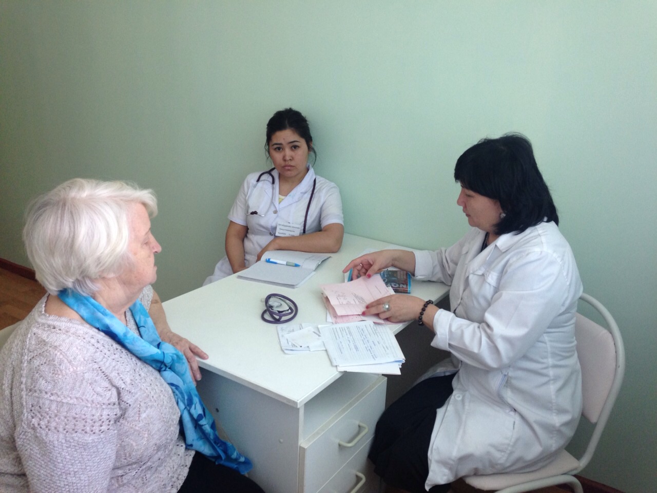 13 апреля 2015 г. на базе ГКП на ПХВ «Поликлиника ВОВ» состоялся День открытых дверей, в честь Победы Великой Отечественной Войны. Помощь пожилым людям также оказывали студенты группы 520-1,2. Было осмотрено 78 пациентов.