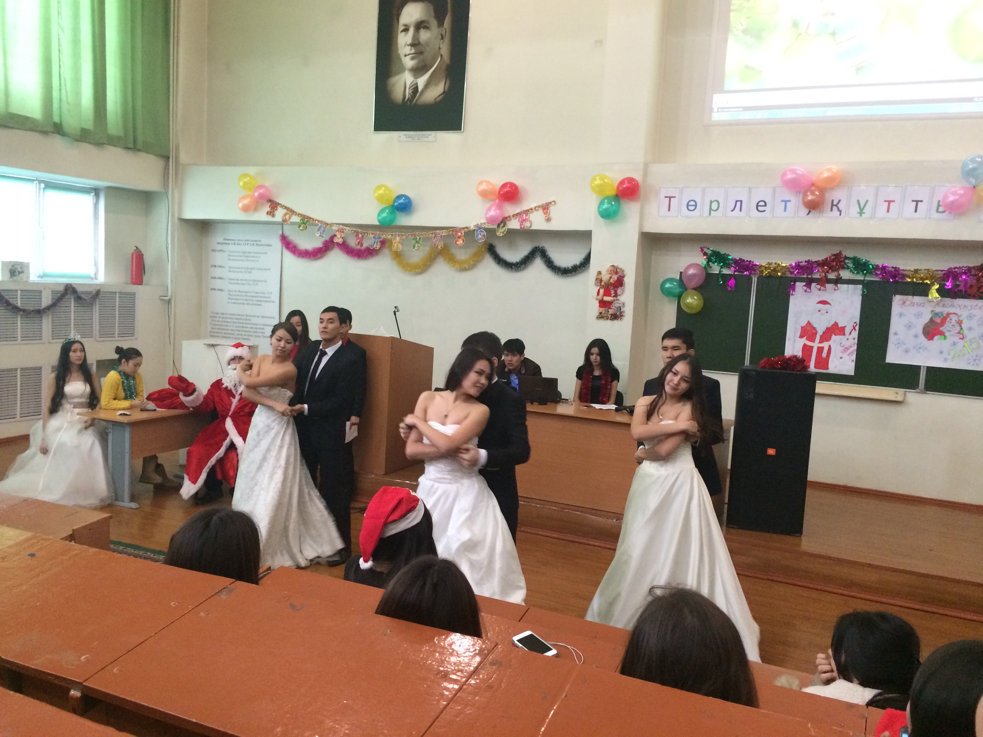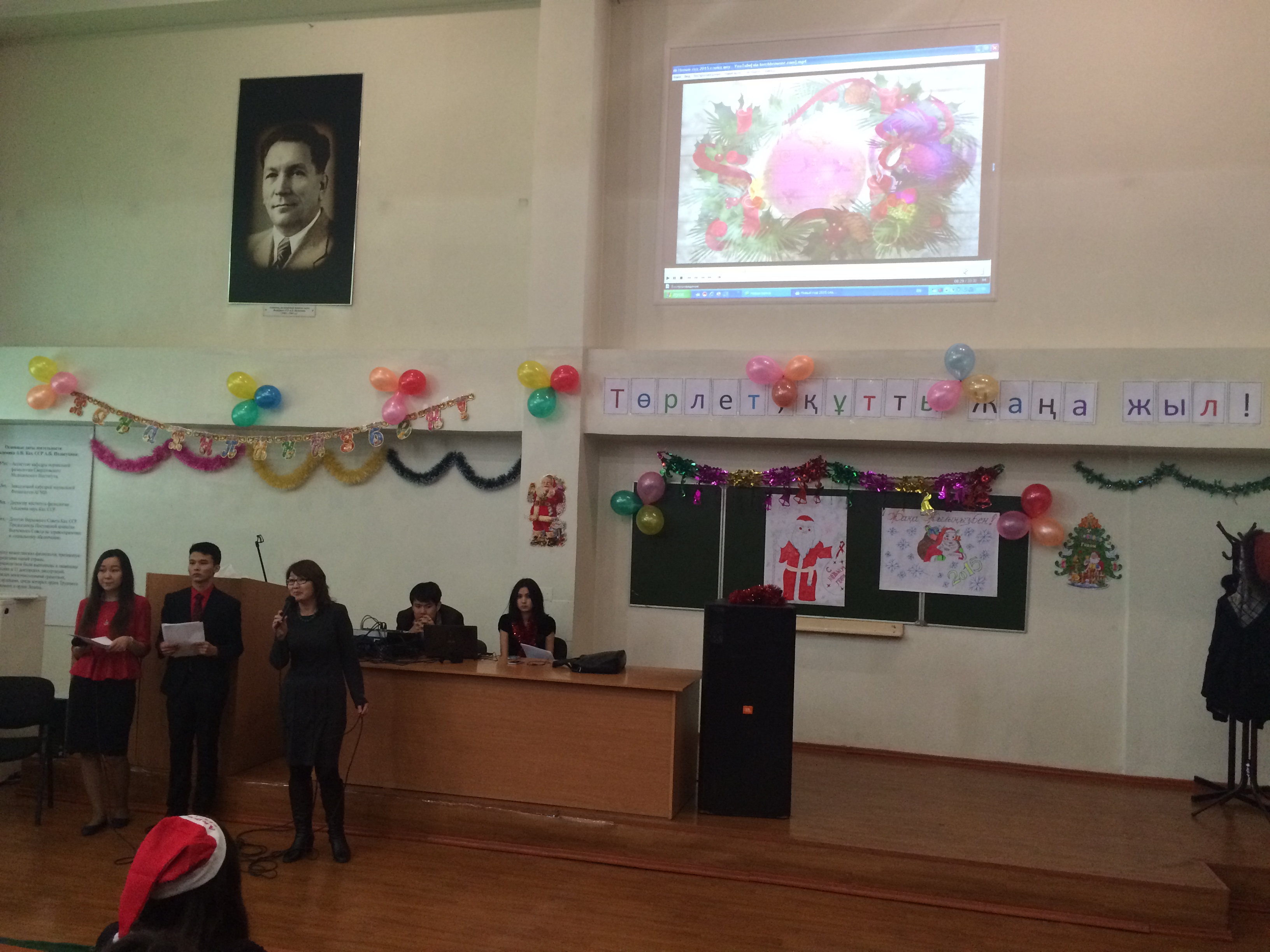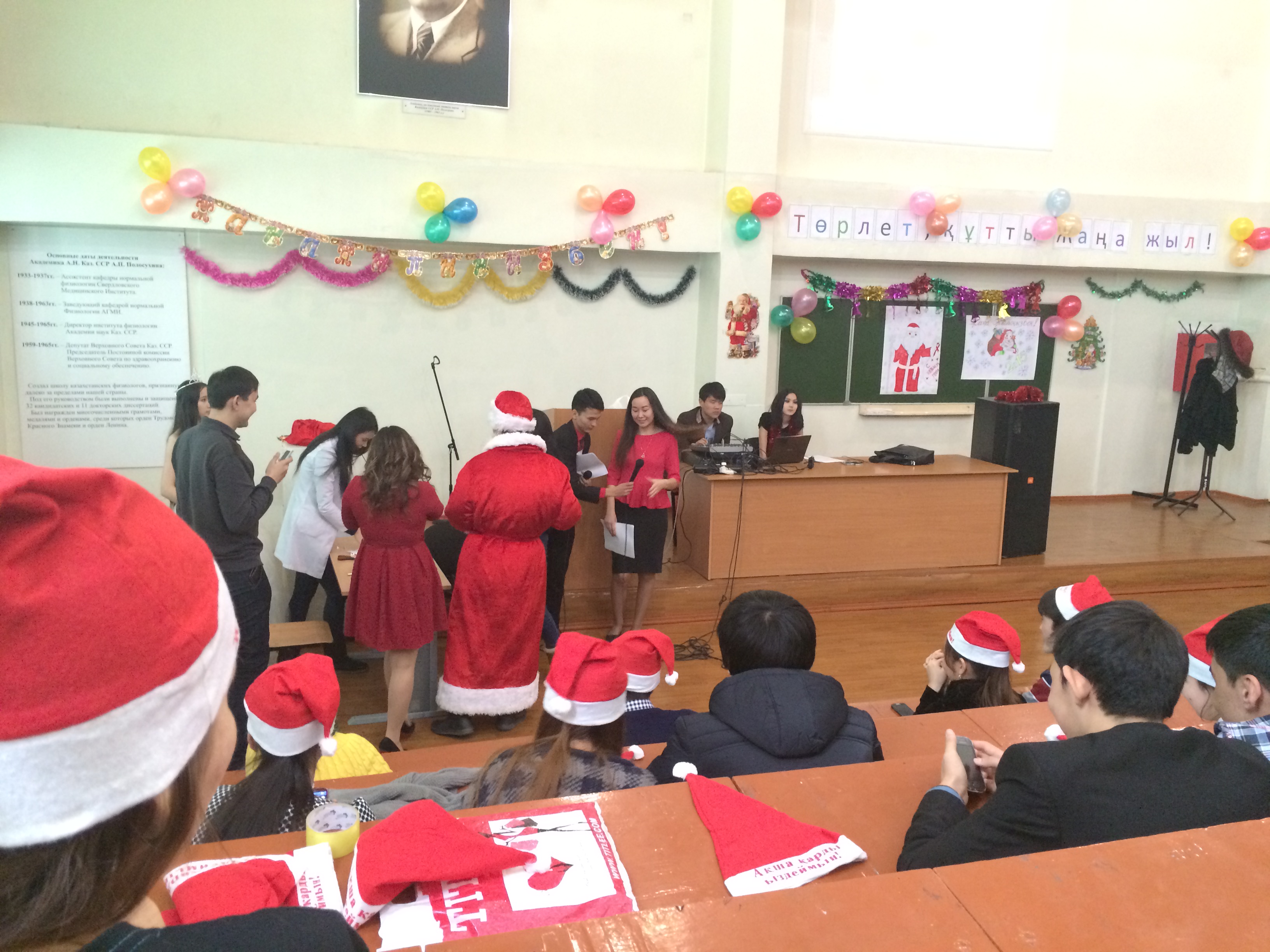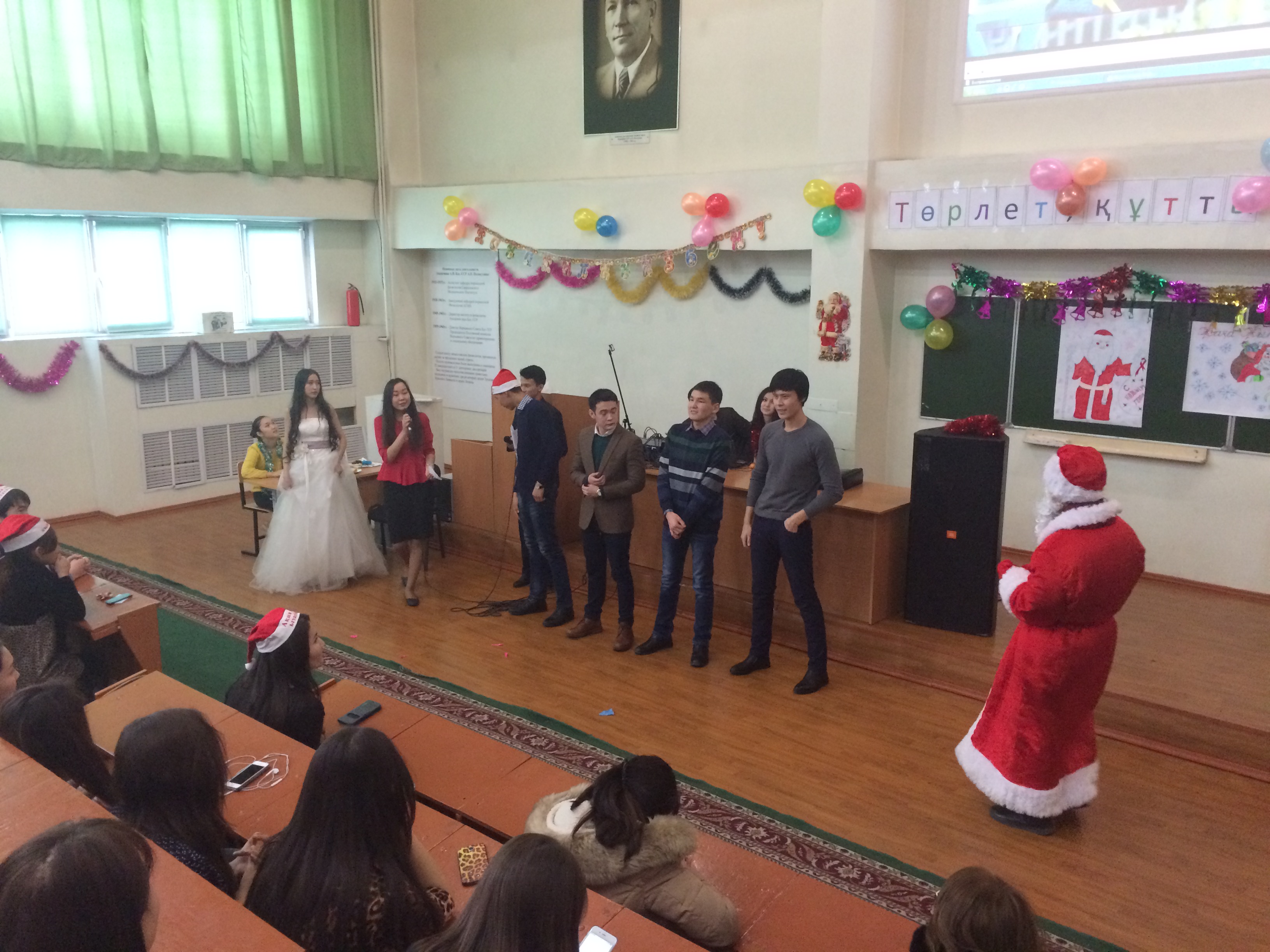 Жаңа жыл-қашанда әр адамның жүрегіне жаңа үміттер мен аппақ армандар ұялататын, ғажайып қиялдарға қол создыратын ең сүйікті мерекеміз. Осы мерекеге орай «Қалыпты физиология» кафедрасы және Жалпы медицина факультетінің 1 курс (009, 010, 012 топтары) студенттерінің ұйымдастыруымен  «Төрлет, құтты Жаңа жыл!» атты мерекелік кеш өтті. Кешке кафедраның оқытушылары мен студенттер қатысты. Кешті өзінің құттықтау сөзімен  қалыпты физиология кафедрасының оқытушысы, аға тьютор Джусипбекова Балжан Абдрамбековна ашты. Мерекелік кешіміз қыздар мен жігіттерден құралған «Сағындым Алматымды » атты әнге ырғақты бимен басталды. Жаңа жылдық кешіміздің сәнін кіргізген кейіпкерлеріміз Аяз ата ролінде Оралбаев Абзал мен Ақшақар ролінде Тас Мадина ойнады. Әсем әндер шырқалды: Атажанова Зульфия, Маралбай Даурен, Бабахан Сержан және  би биленді. Қонақтарымыздың көңілін көтеру үшін қызықты ойындар ойнатылды, ойынға студенттер мен оқытушылар қатысты. Барша өнерпаздарымыз бен ойынға қатысушыларға Аяз ата сыйлықтарын таратты. Кеш соңында оқытушы Кожаниязова Ардак Нургалиевна жиналған қауымды жаңа жыл мерекесімен құттықтап, қортынды сөз сөйледі.   Кеші көңілді, әрі әсерлі өтті.