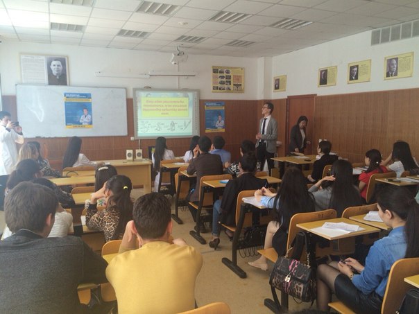 2015 жылы 22-сәуір күні жедел медициналық жәрдем кафедрасы оқытушылары және ЖМ факультетінің 5- курс студенттері Әл-Фараби атындағы ҚазҰУ –да жалпы факультеттік салауатты өмір салтын құру үшін іс-шара ұйымдастырылды. ҚазҰУ –ң химиялық факультетінің 1-курс студенттеріне Жалпы медицина факультеті қазақ бөлімі 531 -1 топ студенттері «Дәрілік заттарды қауіпсіз қолдану» атты интерактивті дәріс өткізді. Іс-шара барысында қатысушыларға анкета таратылды, ЖМ 5-курс студенттері қазақ тілінде дәріс-дискуссия оқыды; дәрілік заттарды қауіпсіз қолдану байланысты видеофильм көрсетіліп, ҚазҰУ студенттерімен интерактивті ойын-дискуссия өткізілді. Студенттерге оқылған дәріске кері байланыс мақсатында бірнеше тапсырмалар берілді. Бұл іс –шараны белсенді ұйымдастырушылар: доц. Нуфтиева А.И., ЖМ факультеті 5-курс 531 – 1 топ студенттері. ЖОО-ның студенттерінде педагог ретінде дәріс оқу, берілген тақырып бойынша қызығушылығын ояту мүмкіндіктері болды. Басқа ЖОО студенттері мен оқытушыларымен бұл тақырыпты талқылау барысында қызық дискуссия орын алды. 1-курс студенттері қойған 20 –ға жуық сұрақтарына толық және нақты жауаптар ала алды.