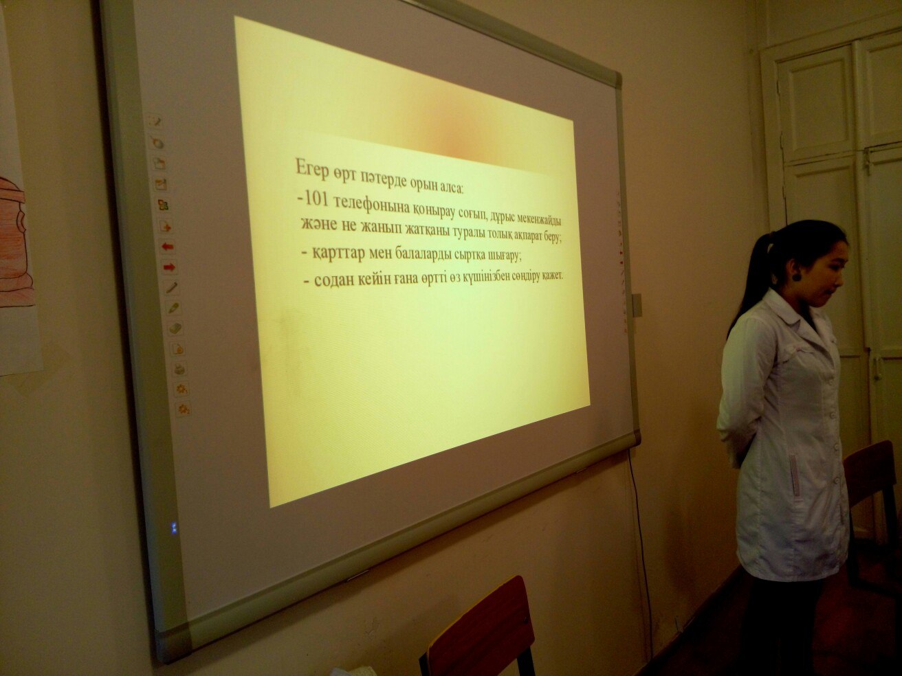 17.11.2015ж сағат 1000 Алматы қаласы Теміржол ауруханасында Гистология модулінің жетекшілігімен жалпы медицина факультетінің 13-27-01, 02 топ студенттері ашық сабақ өткізді. 2015жылды қорытылай келе Алматы қаласында өрт жағдайлары жиілеуіне байланысты «Өрт қауіпсіздігіне қойылатын талаптар» атты тақырып қарастырылды. Өрт кезіндегі ережелер, өзін-өзі ұстау психологиясы, алғашқы іс-әрекеттер жайлы мәліметтер айтылды. Өрт кезіндегі іс-әрекеттерді білу дәрежесін анықтау мақсатында сұрақ-жауап жүргізілді.