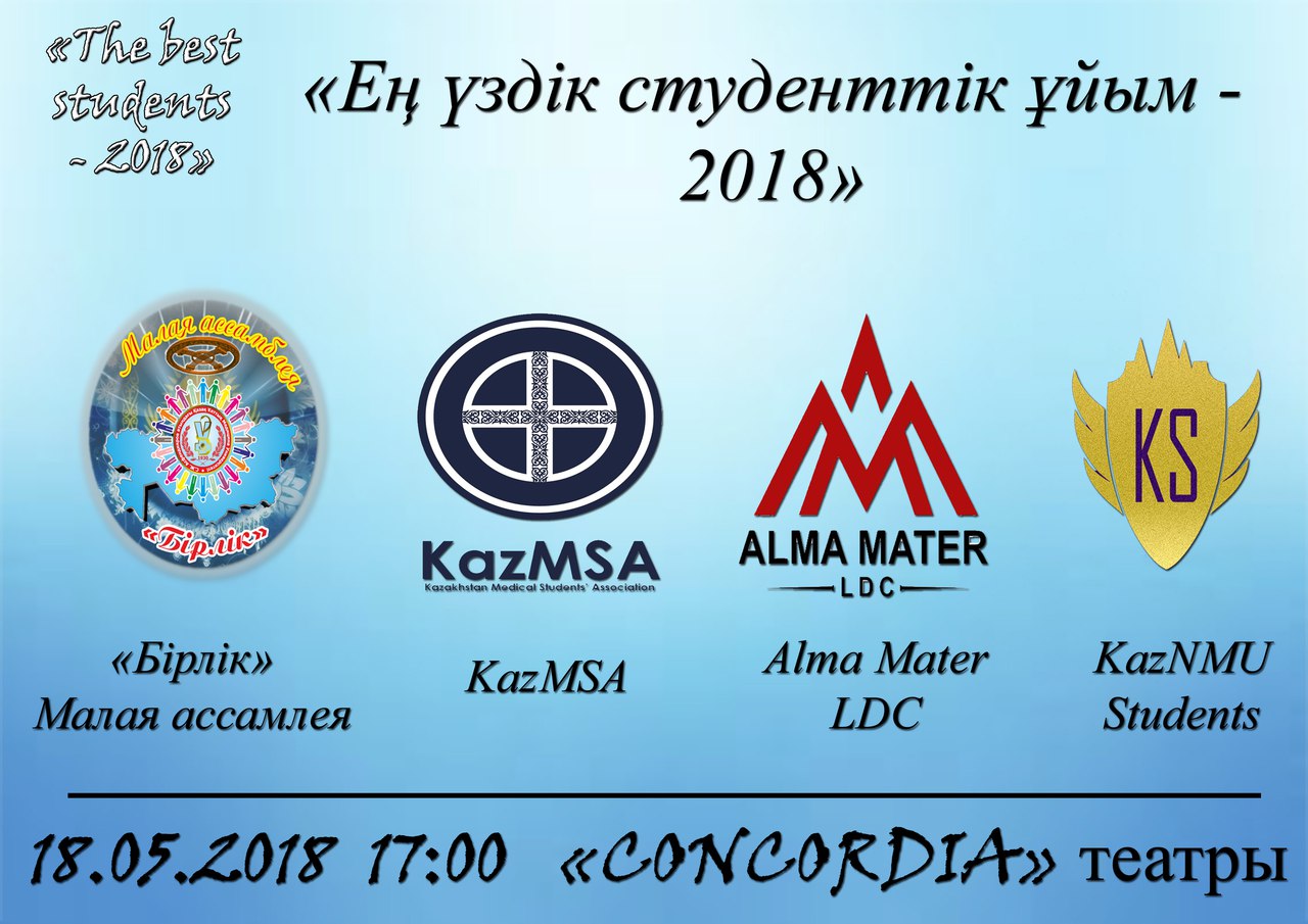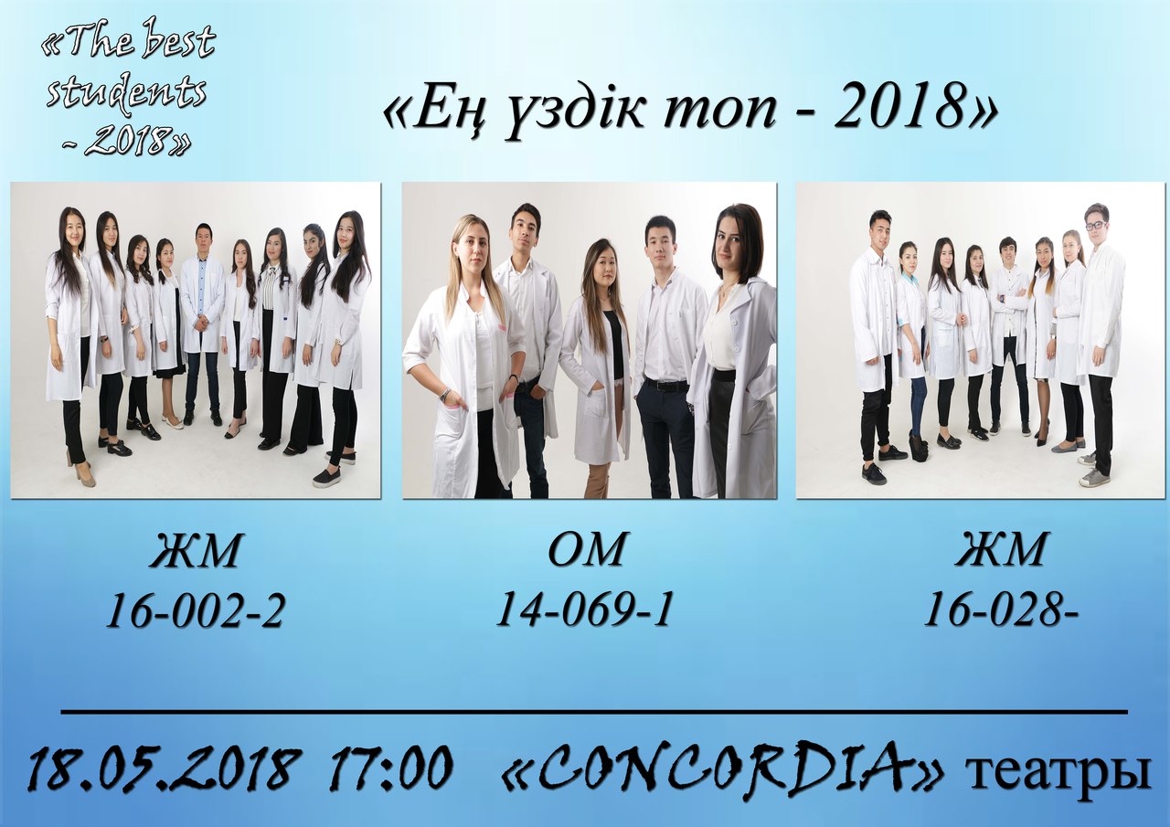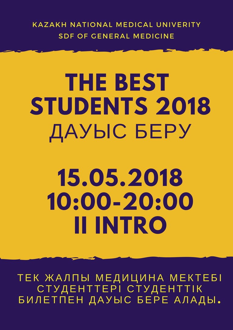 Сіздерді Жалпы медицина мектебі студенттік Деканаты ҚазҰМУ Білім алушылар кәсіподағы қолдауымен өтетін дәстүрлі , үздіктерді анықтайтын «The best students -2018» байқауының финалдық кезеңі дауыс беруге шақырамыз. Дауыс беру 15 мамыр күні сағат 10:00 – 20:00 арасында II интрода өтеді. Дауыс беруге Жалпы медицина мектебі студенттері студенттік билетпен дауыс бере алады. Комиссия шешімі және студенттер дауысы қоса ең көп дауыс жинаған студенттер 18 мамыр күні 17:00-де «Concordia» театрында «The best students -2018» байқауы қорытынды кешінде анықталып, марапатталады.