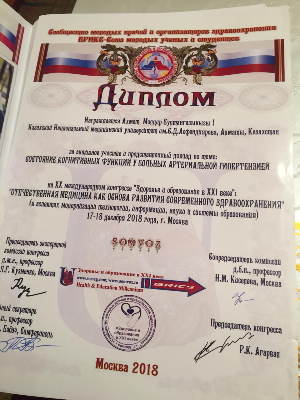 17-18 декабря 2018г в г.Москва сообщество молодых врачей и организаторов здравоохранения БРИКС-Союз молодых ученных и студентов провел XX Международный конгресс «Здоровье и образование в XXI веке», «ОТЕЧЕСТВЕННАЯ МЕДИЦИНА КАК ОСНОВА РАЗВИТИЯ СОВРЕМЕННОГО ЗДРАВООХРАНЕНИЯ» (в аспектах модернизации технологии, информации, науки и системы образования),