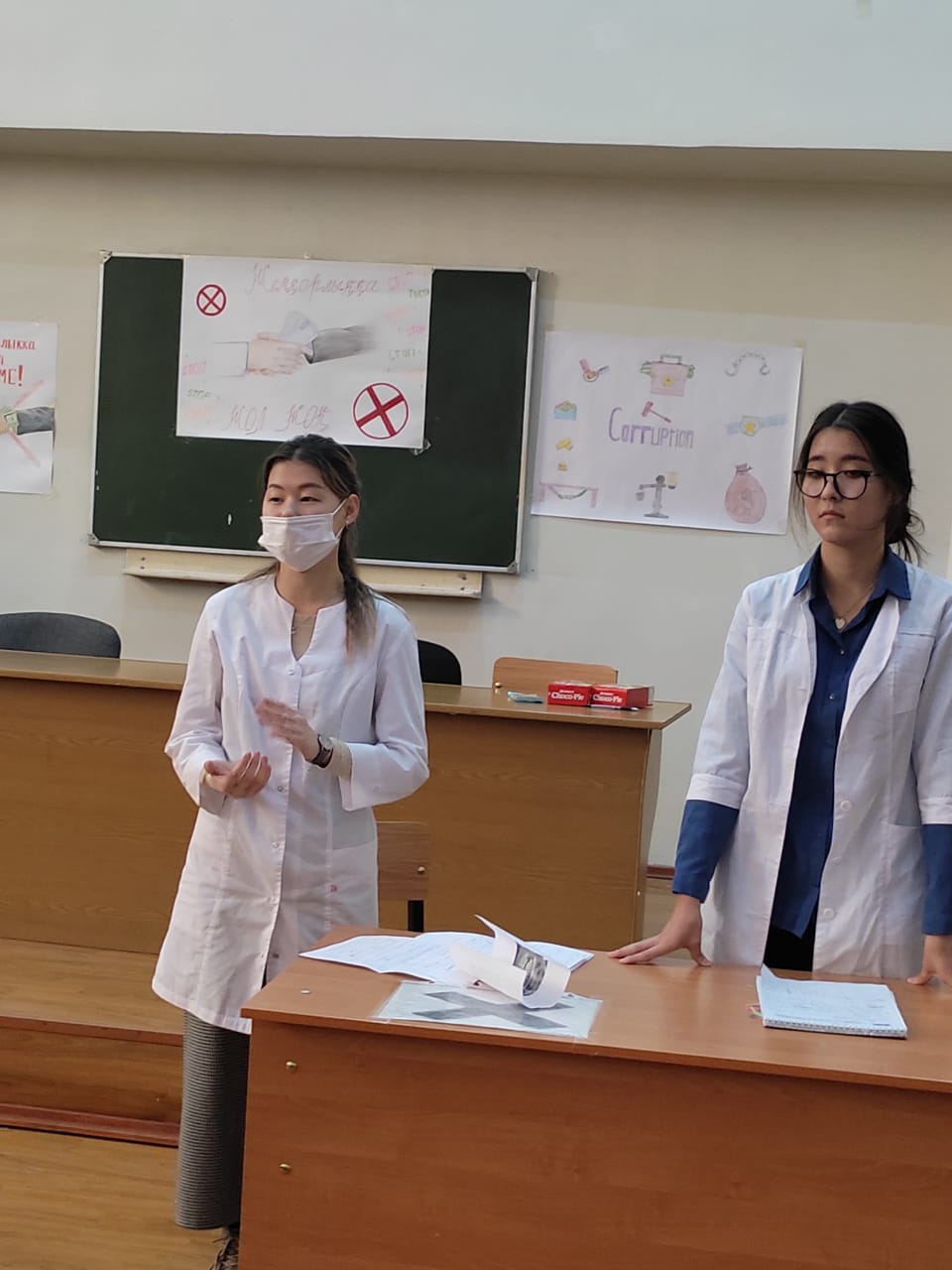 Іс-шараға 21-015(001)ЖМ, 21-002(02)ҚДС, 21-012(001)СТ, 20-19(002)ТФП, 21-01(01) Фарм 1,2 курс студенттері қатысты. Тақырыпқа байланысты презентациялар дайындап, викториналық ойындар ойнатты. Сұрақтарға дұрыс жауап берген студенттер сыйлыққа ие болды. Сыбайлас жемқорлыққа байланысты көріністер қойылды. Студенттер өздері видео материал дайындады. Жемқорлыққа байланысты заңдар айтылды. Соңында студенттер өз қолдарымен жемқорлыққа қарсы жасап алып келген плакаттарын сайысқа салды.