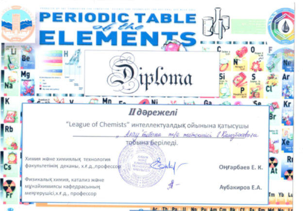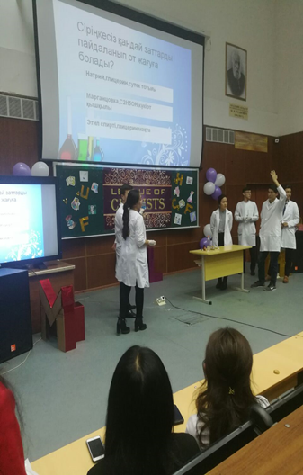 Жақында аль-Фараби атындағы Қазақ Ұлттық Университетінің химия және химиялық технология факультетінің физикалық химия, катализ және мұнайхимиясы кафедрасында С.Ж. Асфендияров атындағы Қазақ Ұлттық Медициналық Университетінің биологиялық химия кафедрасының, Абай атындағы ҚазҰПУ химия кафедрасының, Алматы Технологиялық Университетінің химия, химиялық технология және экология кафедрасы мен ҚазҰУ студенттері қатысқан «League of chemists» атты интеллектуалдық сайысы өтті. 5 турдан тұратын сайысқа құрама тоғыз команда қатысты. Жас инженер-химиктер және болашақ медиктер куратор-эдвайзер А.А.Батырбаева, 6М060600-Химия мамандығындағы магистранттары және ОЗХТ-206 топ студенттері дайындаған интеллектуалды сайыстың бағдарламасынан мүдірмей өтті.