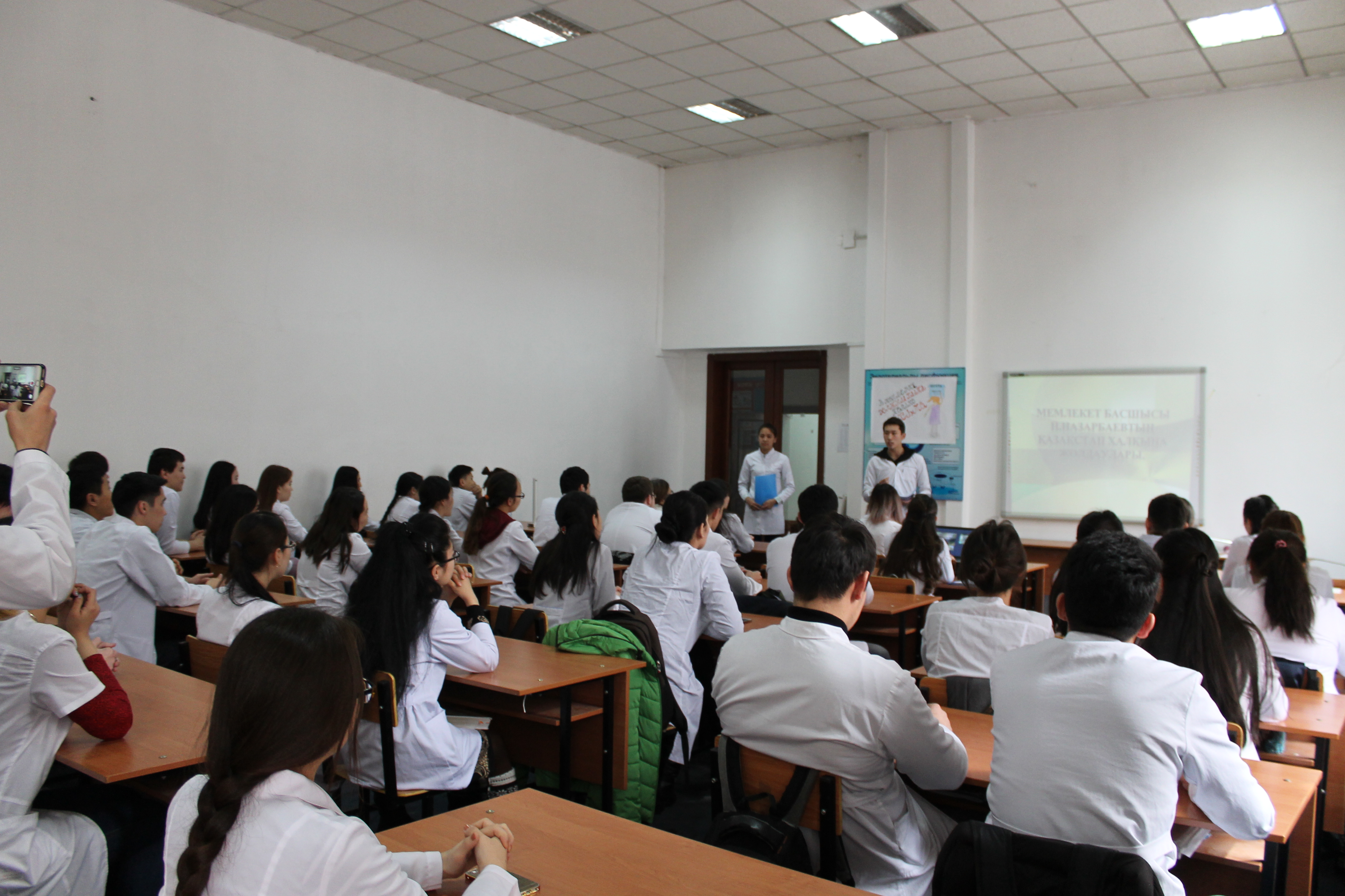 Ответственные за мероприятие и студенты 14-030-02 группы III курса факультета «Общая медицина» обратили внимание студентов на важность Послания Президента Республики Казахстан Н.А.Назарбаева народу Казахстана от 31 января 2017 г. «Третья модернизация Казахстана: глобальная конкурентоспособность». Обозначенные президентом нашей страны Нурсултаном Абишевичем Назарбаевым пять основных приоритетов Третьей модернизации Казахстана, безусловно, позволят создать новую модель экономического роста, которая обеспечит успешное продвижение нашей страны в число тридцати самых передовых государств мира. И главное – это то, что послание не только дает нам четкие цели для работы в предстоящий период, но и обладает мощной консолидирующей силой, которая, несомненно, мобилизует всех казахстанцев для дальнейшей реализации Стратегии «Казахстан-2050» на базе Плана нации «100 конкретных шагов.