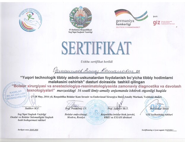 - Неонатальді хирургиядан өткізілген мастер-класс – доцент Мокрушина О.Г. кафедра детской хирургии Российского государственного медицинского университета. (КазНМУ, кафедра детской хирургии, Центр неотложной медицинской помощи г. Алматы 2013г.)