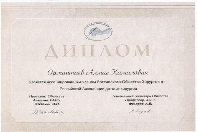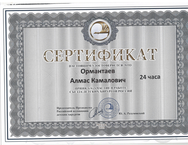 - «Балалардың аяқ пен қолының күрделі туа және жүре пайда болған патологиясы кезінде хирургиялық ем» бойынша өткізілген мастер-класс ФГБУ НИДОН им.Г.И. Турнера, Россия.