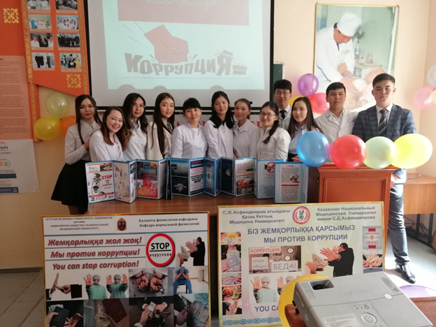 2018-2019 оқу жылындағы «Қалыпты физиология» кафедрасыныда сыбайлас жемқорлыққа қарсы кеңесінің ұйымдастыруымен «Біздің таңдауымыз жемқорлықсыз болашақ!» атты іс-шара мектеп деңгейінде өткізілді. Іс-шараға «Қалыпты физиология» кафедрасының меңгерушісі Ш.О. Рыспекова, кафедра профессоры А.Д. Соколов, Жалпы медицина мектебінің деканы Г.А. Шопаева, жалпы медицина мектебінің орынбасары Ж.Б.Садық шақырылды. Кафедраның аға оқытушысы Б.А.Джусипбекова, оқытушылар К.К. Мусина, Г.М. Айтжанова. Іс-шараға кафедраның профессорлық-оқытушылық құрамы мен жалпы медицина мектебі және халықаралық медицина факультетінің 1 курс студенттері қатысты. Іс-шараны 1 курс студенті А.Қанатов «Адай» күйімен ашты. Алғашқы сөз кафедра профессоры А.Д.Соколовқа берілді. Профессор Соколов студенттерге кафедраның сыбайлас жемқорлыққа қарсы кеңесі жұмысы жөнінде мағлұмат бере отырып, жас ұрпақты жемқорлықсыз болашаққа жетелейтін жолдардан таймауды ұсынды. Жалпы медицина мектебінің 1 курс студенттері Н.Омірзакова, А.Мейрбек, А.Жали «Жемқорлық-індет,жою-міндет!» атты тақырыбына үш тілде баяндамаларын жасады. Баяндамада жемқорлық және оның зардаптары көрсетілді. «Жемқорлық және медицина» тақырыбына осы мектептің 1 курс студенттері А.Қанатов, Ж.Әдехан,Е.Қуандықовтың орындауында жасалған бейнероликтері көрсетілді. 1-курс студенттері А.Мейрбек пен Н.Омірзакова жемқорлықпен күресті өлең жолдарымен жеткізді. «Жемқорлықпен күрес-басты міндет» тақырыбында түрлі буклеттер дайындалды. «Жемқорлық» тақырыбында халықаралық медицина мектебінің ағылшын бөлімінің студенттері А.Чаударри мен М.Рақымжанов өз баяндамаларын ұсынды, баяндамада басты назар жемқорлықпен күрес жолына қойылған.