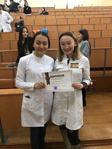 Сонымен қатар «Жалпы медицина» мамандығының 4 курс студенттері Шапиева А. «ҚазҰМУ студенттерінің кенелік энцефалит бойынша ақпараттылығын талдау» баяндамасымен қатысып 3-орынды жеңіп алды (ғылыми жетекшісі Егембердиева Р.А.).
