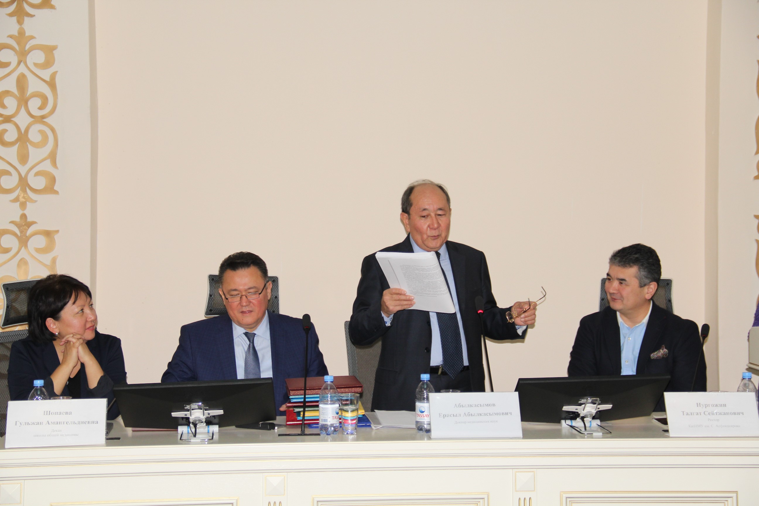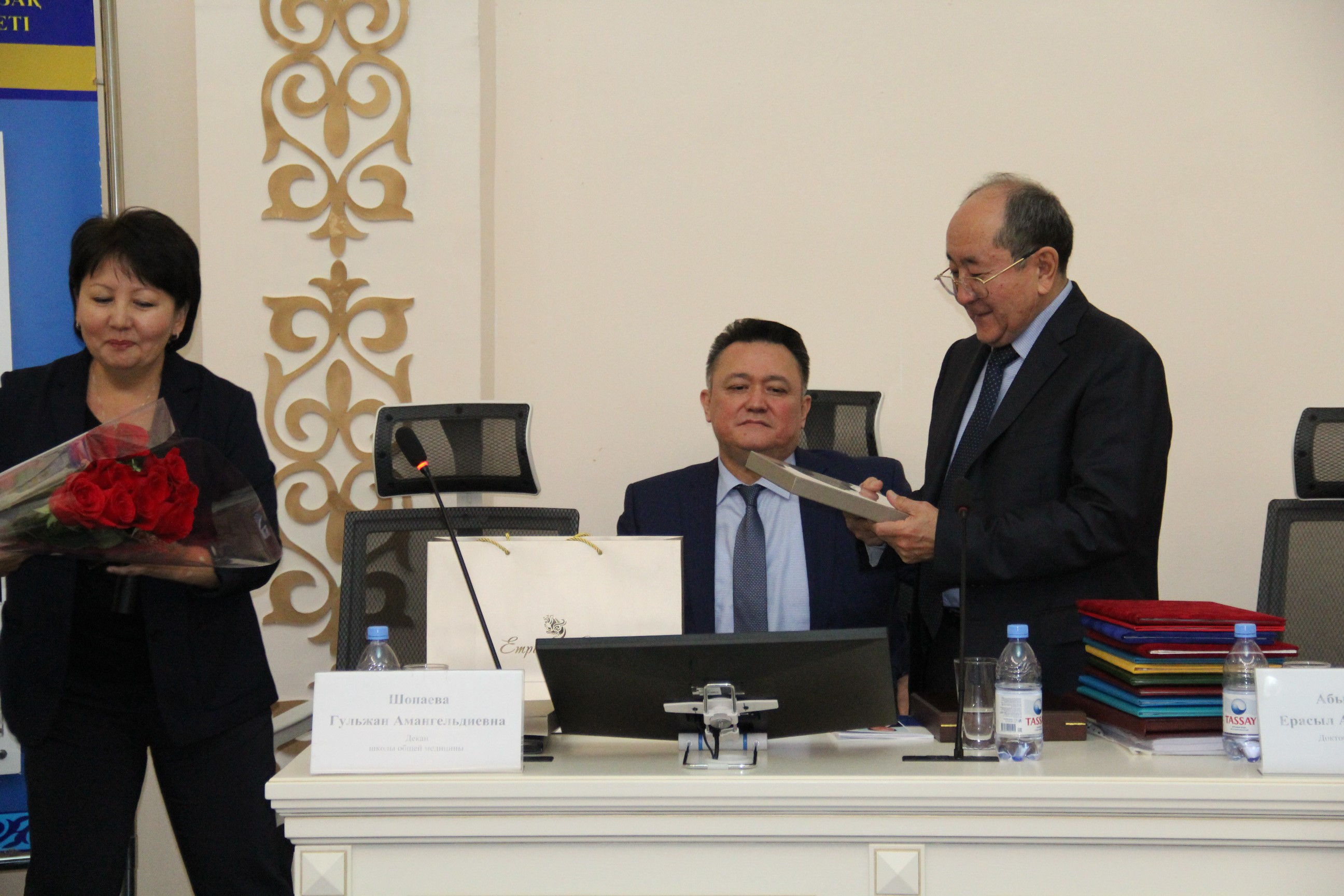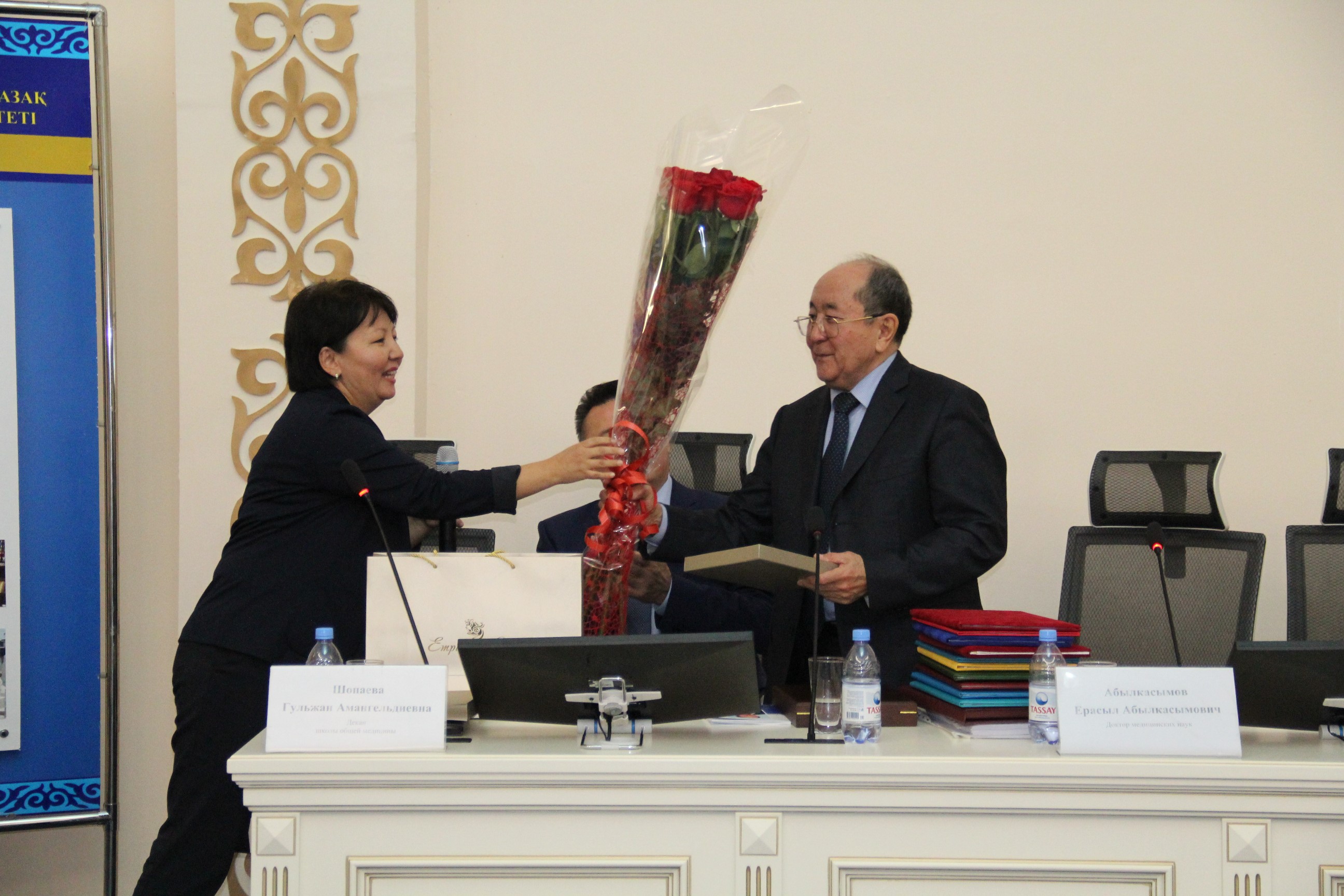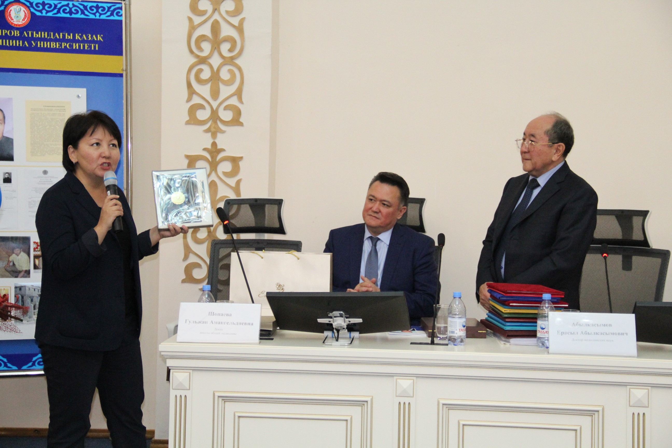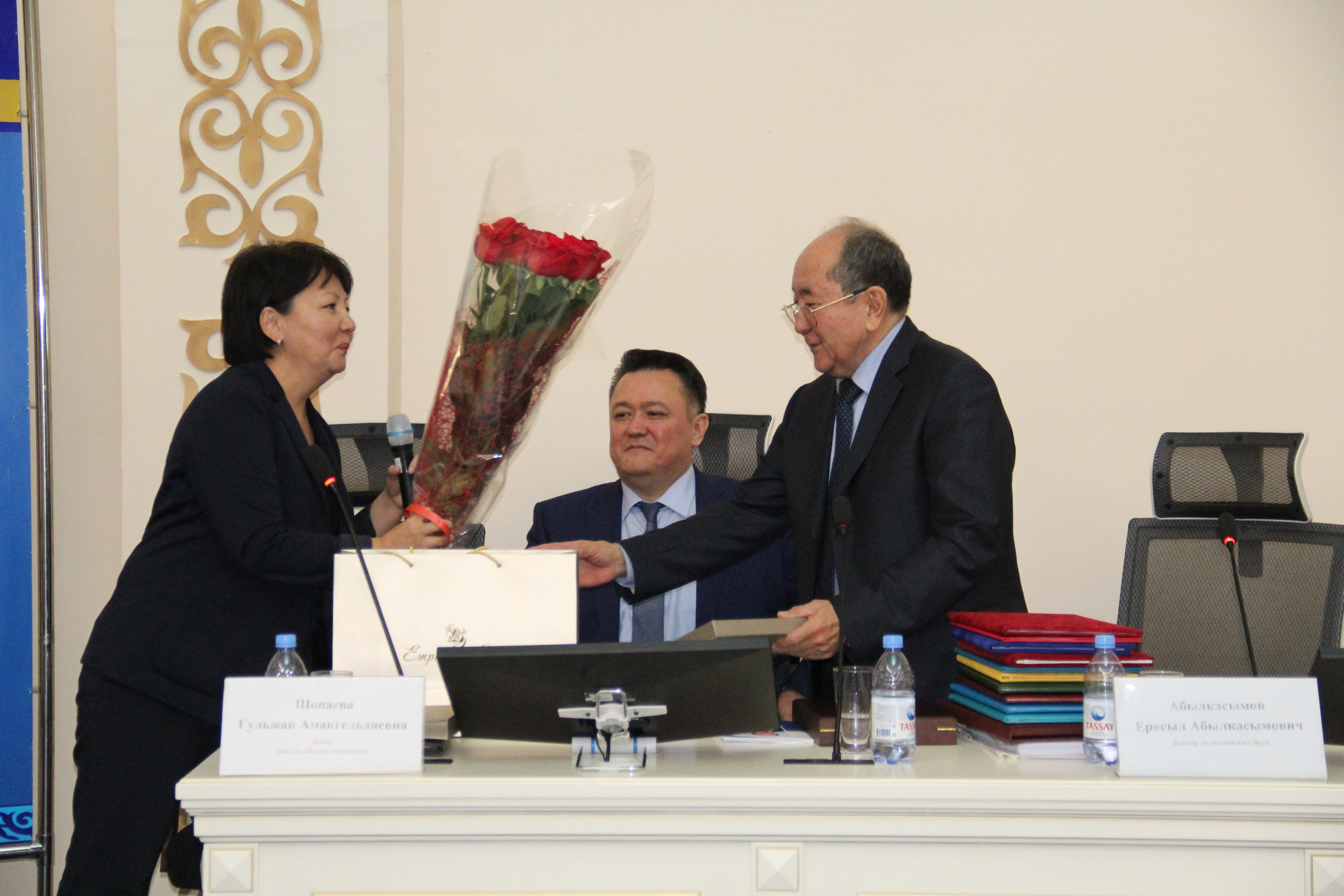 С поздравительным словом выступил ректор КазНМУ им.С.Д.Асфендиярова д.м.н., профессор Нургожин Т.С., а также гости – ректор Казахско-Российского медицинского университета д.м.н., профессор Джайнакбаев Н.Т., директор филиала фонда социального медицинского страхования по г.Алматы, д.м.н. профессор Абильдаев Т.Ш.