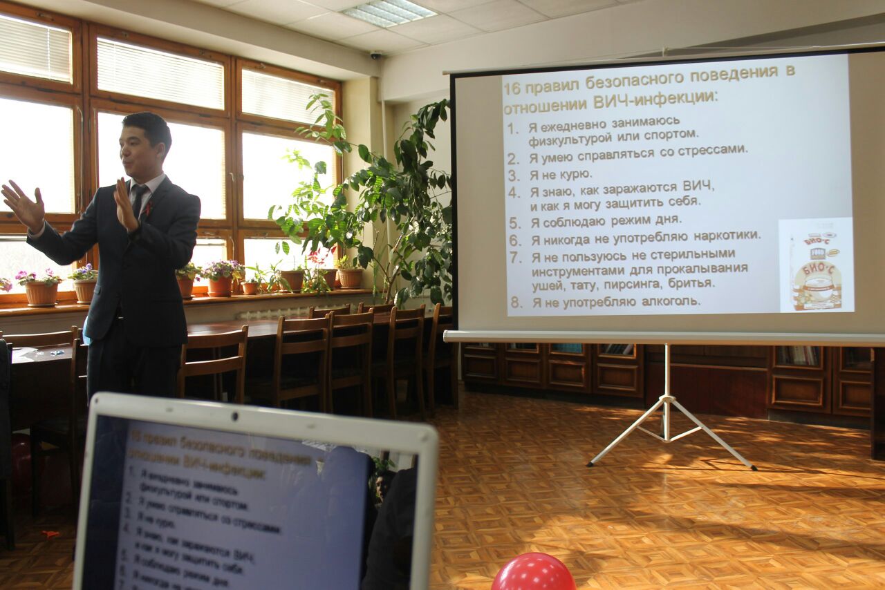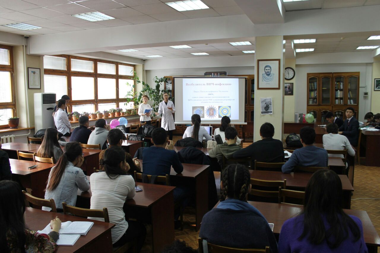 Желтоқсан айының сегізінші жұлдызында біздің университетіміздің Жалпы медицина факультетінің 5-курс студенттері,13-009-1 және 13-012-1 топтарының ұйымдастыруымен (топқа жауапты Жүйке аурулары кафедрасының профессоры Туруспекова С.Т.)Алматы Энергетика және Байланыс университетінде «ЖИТС: қорқу қажет емес,білу қажет!» атты тақырыпта шара өткізілді. Ондағы мақсат жастарды ЖИТС-тің қауіптілік деңгейін,одан қалай сақтану және алдын алу керектігі жөнінде кеңінен ақпараттандыру.Бұл шара екі бөлімнен тұрды. Бірінші бөлімде медицина студенттері ВИЧ инфекциясы қазіргі таңдағы өте өзекті мәселердің бірі екендігін,толық анықтама беріп кететін болсақ-адамның иммунтапшылығының нәтижесінде дамитын вирус болып табылады,иммундық жүйені біртіндеп зақымдайды,ол тек адам ағзасында ғана өмір сүреді және ұзақ жылдар бойы.Ағзаның инфекцияға қарсыласу күші төмендеп, адамда өте сирек кездесетін инфекциялық аурулар дамиды.ЖИТС ВИЧ инфекциясы дамуының ең соңғы деңгейі екендігі жөнінде мағлұмат беру,сонымен қатар ЖИТС ауруының пайда болу тарихы туралы,елімізде қашан тіркелгендігі жөнінде,оның таралуы,жұғу жолдары,және алдын алуы,қалай қорғануға болатындығы жөнінде жастарды барынша жоғары деңгейде ақпараттандыруға тырысты. Және аудиториямен тығыз байланыс орнатылды,викториналық сұрақтар қойылды,ЖИТС туралы не білетіндіктері жөнінде сауалнамалар таратылды.Тыңдалымға қатысқан Алматы Энергетика және Байланыс университетінің студенттері қойылған сұрақтарға жауап беруде барынша белсенділік танытты,олар да өз білгендерін ортаға салды,білмеген сұрақтарына да жауап алуға тырысты.Соңына таман медицина студенттері дайындаған брошюралар таратылды,ол арқылы да жастар өздеріне керекті кеңестер ала алады деген мақсатпен.Ал екінші бөлім студенттерді сергіту мақсатында театрлық скечтермен,сюжеттік жағдайлық есептермен және концерттік нөмірлермен толықты.Әрине тақырыптан тыс емес,негізгі тақырыптың аясында,яғни ВИЧ инфекциясының үш жұғу жолын, жүктілік кезінде анадан балаға,сақтанбаған жыныстық қатынас және емдеу мекемелерінде залалсыздандырылмаған шприц арқылы жұқтырылған үш тағдыр көріністе баяндалды. Домбыра шертілді,ән шырқалды.Бұл қойылған шарада медицина студенттері қазіргі заманның өзекті мәселесін жан-жақты көрсете білді , және жастардың санасына кішкене болсада сіңірілді деген ойдамыз.