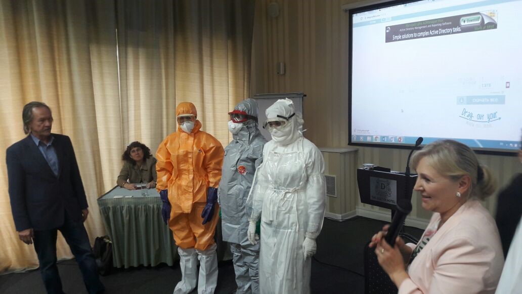Кафедра қызметкерлері Аса қауыпты инфекция анықталғандағы шаралар алгоритмі» атты шеберлік класста (Алматы, 2017 ж.)
