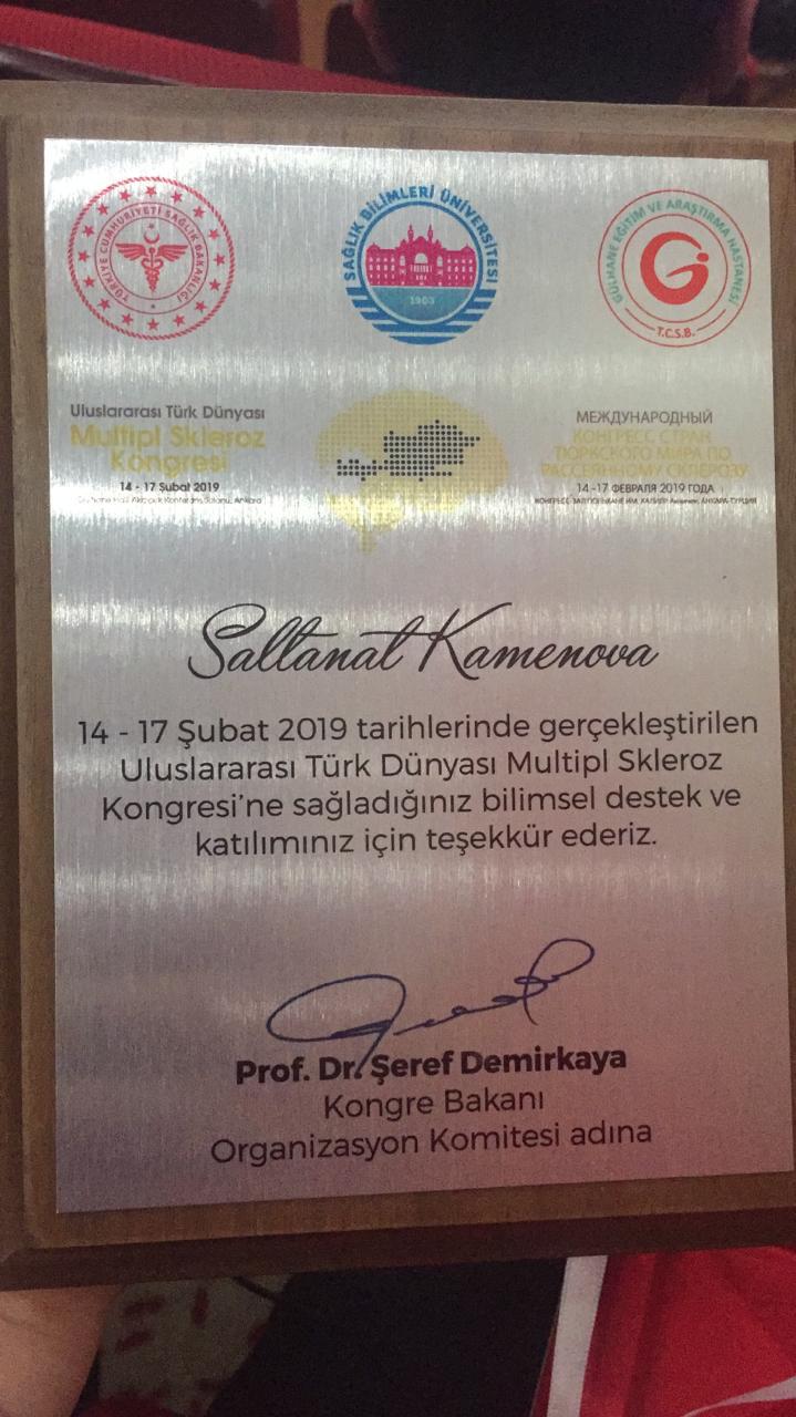 С 14 по 17 февраля 2019 года в Анкаре прошел Конгресс стран тюркского мира по рассеянному склерозу (MS). На конгрессе обсуждались вопросы в области нейроиммунологии и рассеянного склероза и их применение в клинической деятельности. В работе конгресса приняли активное участие эксперты в области рассеянного склероза из стран тюрского мира, в числе которых были сотрудники кафедры нервных болезней с курсом нейрохирургии профессора: Нургужаев Е.С., Туруспекова С.Т. и Каменова С.У. На конгрессе выступила проф. Каменова С.У. с докладом на тему: «Kazakistanda Multipl Skleroz tani ve tedavisi». Доклад вызвал большой интерес среди слушателей. По результатам конгресса были заложены основы сотрудничества по вопросам диагностики и лечения с коллегами тюркских стран: Узбекистана, Азербайджана, Кыргызстана, Туркмении и Турции.