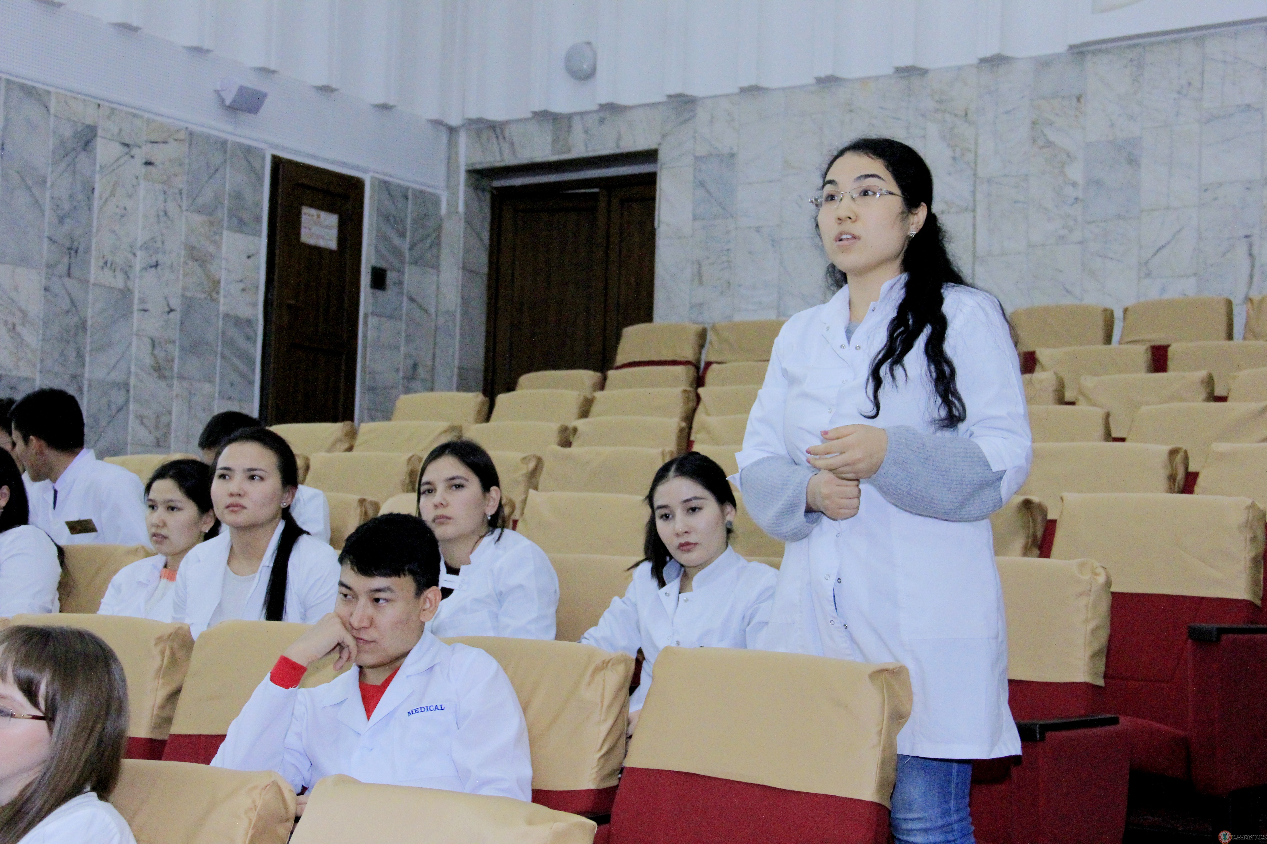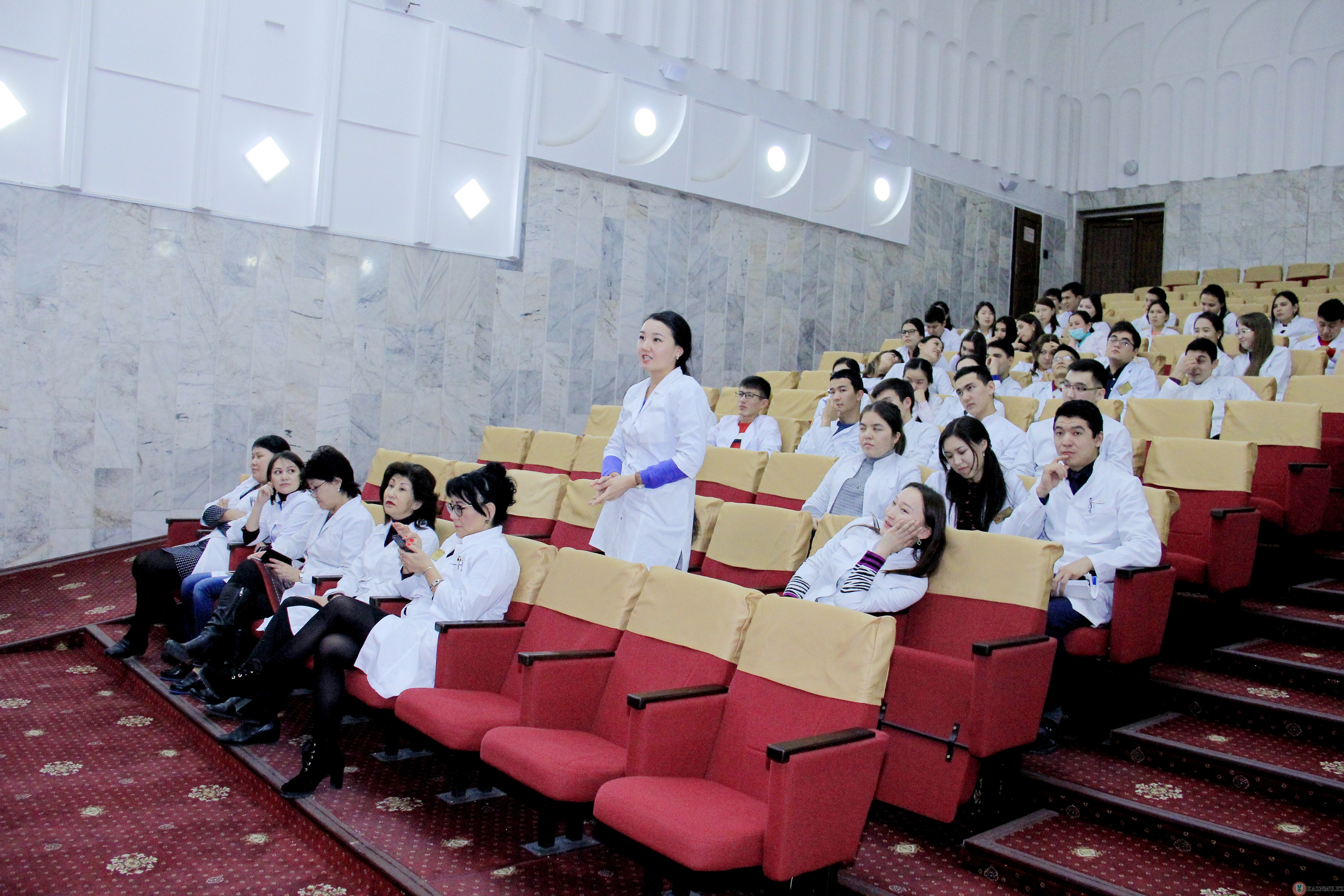 Cтуденты 5 курса специальности «Общая медицина» 001-1, 010-2 группы на практических занятиях провели конференцию по теме «Демиелинизирующие заболевания нервной системы». Актуальность данной темы заключается в ее медико-социальной проблеме. Распространненость демиелинизирующих заболеваниий за последние 10 лет выросла на 5-15 %, составив в среднем 50 больных на 100000 населения. В большей степени данное заболевание встречается в странах Северного полюса. Самое частое из демиелинизирующих заболеваний – рассеянный склероз. РС занимает одно из первых мест среди всех неврологических заболевании. В настоящее время отсутствие полного представления об этиологии и патогенезе заболевания, трудности лечения, высокий уровень инвалидизации делает эту проблему актуальной во всех странах. Конференция была проведена на клинической базе ГКП на ПХВ «Городская клиническая больница №1» на высоком уровне, охватив всех студентов с обратной связью в виде викторины по данной теме.