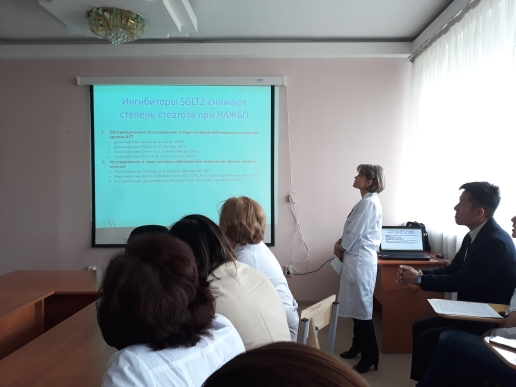 Дөңгелек үстелде №1 ішкі аурулар кафедрасының қызметкерлері: проф. Е.А. Славко, доц. Н.В.Зубова, асс. С.Серікболқызы НАЖБП патогенезі, емдеудің перспективті әдістері, ауру ағымының клиникалық-зертханалық ерекшеліктері туралы хабарламалармен сөз сөйледі.