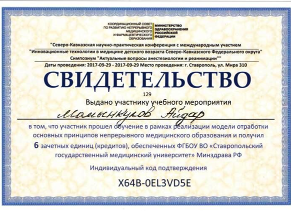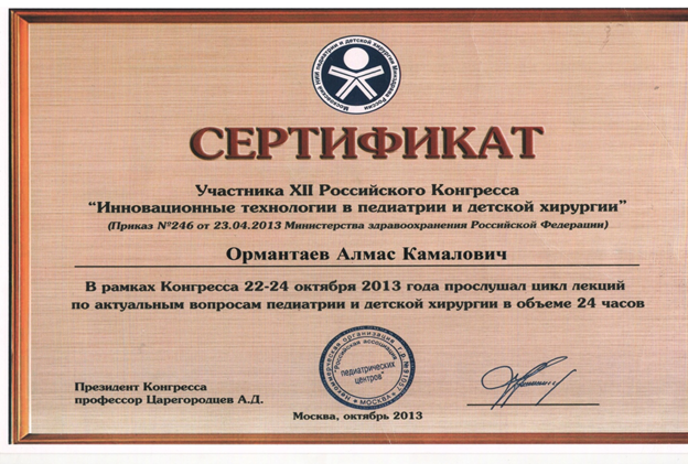- «Балалардың аяқ пен қолының күрделі туа және жүре пайда болған патологиясы кезінде хирургиялық ем» бойынша өткізілген мастер-класс ФГБУ НИДОН им.Г.И. Турнера, Россия.